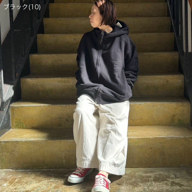 prit ふわもふな裏起毛シリーズより、 リラックスパンツ、パーカー物に続き、前開きダブルZIPのパーカーも入荷しています。 ...................................................... もふもふ感の心地よい裏起毛素材は 締め付け感のないゆるふわさがなんとも言えない心地よさと ざっくり感なシルエットはナチュラルに可愛い印象を受けるスウェット物となっています。 フードだけでも冬場は暖かさが違うのに、 さらに首元をハイネック仕様にし、ボリュームのある起毛仕立てで よりあったかさを感じてもらえるパーカーが魅力的となっています。 腰まわりまである長さで隠したい部分が隠れる安心な長さかと思います。 嬉しいダブルZIP仕様で使い勝手の良さを感じるZIPパーカーとなっています。 ZIPパーカーは、合わせやすく飽きのこないベーシックなカラーを揃えました。 チャコールカラーとブラックカラーの2展開で、ご用意しています。 カラー:チャコール/ブラック サイズ:ONESIZE 着丈75cm 身幅65cm 裄丈84cm 着用モデル:154cm 綿100% 日本製