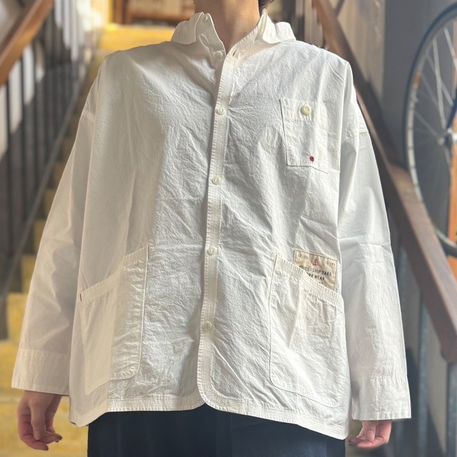 快晴堂 CCBY 羽織デッキシャツ ...................................................... 新作白シャツシリーズより 羽織りにも使えるデッキシャツも入荷しました! アメリカ、ニューヨーク州南頭部の大西洋に浮かぶ島、ロングアイランド。 島の突端には小さな造船所『CAPE COD BOAT YARD』があって… ・・・とゆう徹底された架空の世界観。 快晴堂のこだわりの世界観、物語の中に溶け込んだかのような 雰囲気抜群なシリーズ物となっています。 略して『CCBY』Wear。 その造船所の制服のようなイメージを作り上げてあります。 お仕事着には白シャツは汚れるからと、仕事が終わって着替える服として 真っ白なシャツを造船所の制服のようなイメージで作られた白シャツシリーズです。 通常よりたくさんの手間と時間をかけて練り込んだ究極のナチュラルシワ加工の 生地はシワが消えにくく耐久性のあるシャツとなっています。 自然なシワ感と風合いを感じてもらえてステッチ感を効かせた立体感のある 綺麗なシルエット軽やかなシャツとなっています。 春はやっぱり白シャツ♪ 品番:61S-64 カラー:ホワイト サイズ:FREE 着丈62.5cm 身幅60cm 肩幅54cm 袖丈45cm 裄丈74cm 着用モデル:154cm 綿100% 日本製