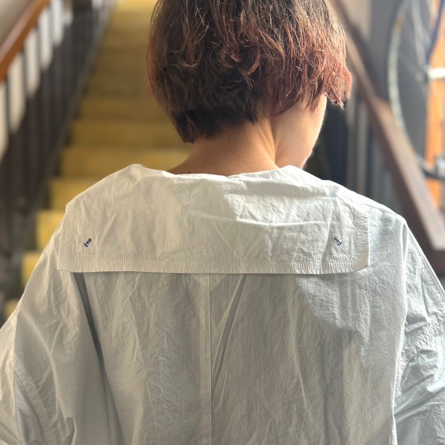 快晴堂 CCBY 白シャツよりジャケットのような丸衿が可愛い《マリネシャツ》も登場しています。 ...................................................... 新作白シャツ物。 春になるとやっぱ着たくなるアイテムです。 アメリカ、ニューヨーク州南頭部の大西洋に浮かぶ島、ロングアイランド。 島の突端には小さな造船所『CAPE COD BOAT YARD』がある… とゆう徹底された架空の物語を元に作られたシリーズ略して『CCBY』Wearです。 仕事が終わって着替える真っ白なシャツを造船所の制服のようなイメージで作られた 白シャツシリーズです。 通常よりたくさんの手間と時間をかけて練り込んだ究極のナチュラルシワ加工の 生地はシワが消えにくく耐久性のあるシャツとなっています。 自然なシワ感と風合いを感じてもらえてステッチ感を効かせた立体感のある 綺麗なシルエット軽やかなシャツとなっています。 品番:61S-67 カラー:ホワイト サイズ:FREE 着丈63cm 身幅60cm 肩幅55cm 袖丈45cm 裄丈72cm 着用モデル:154cm 綿100% 日本製
