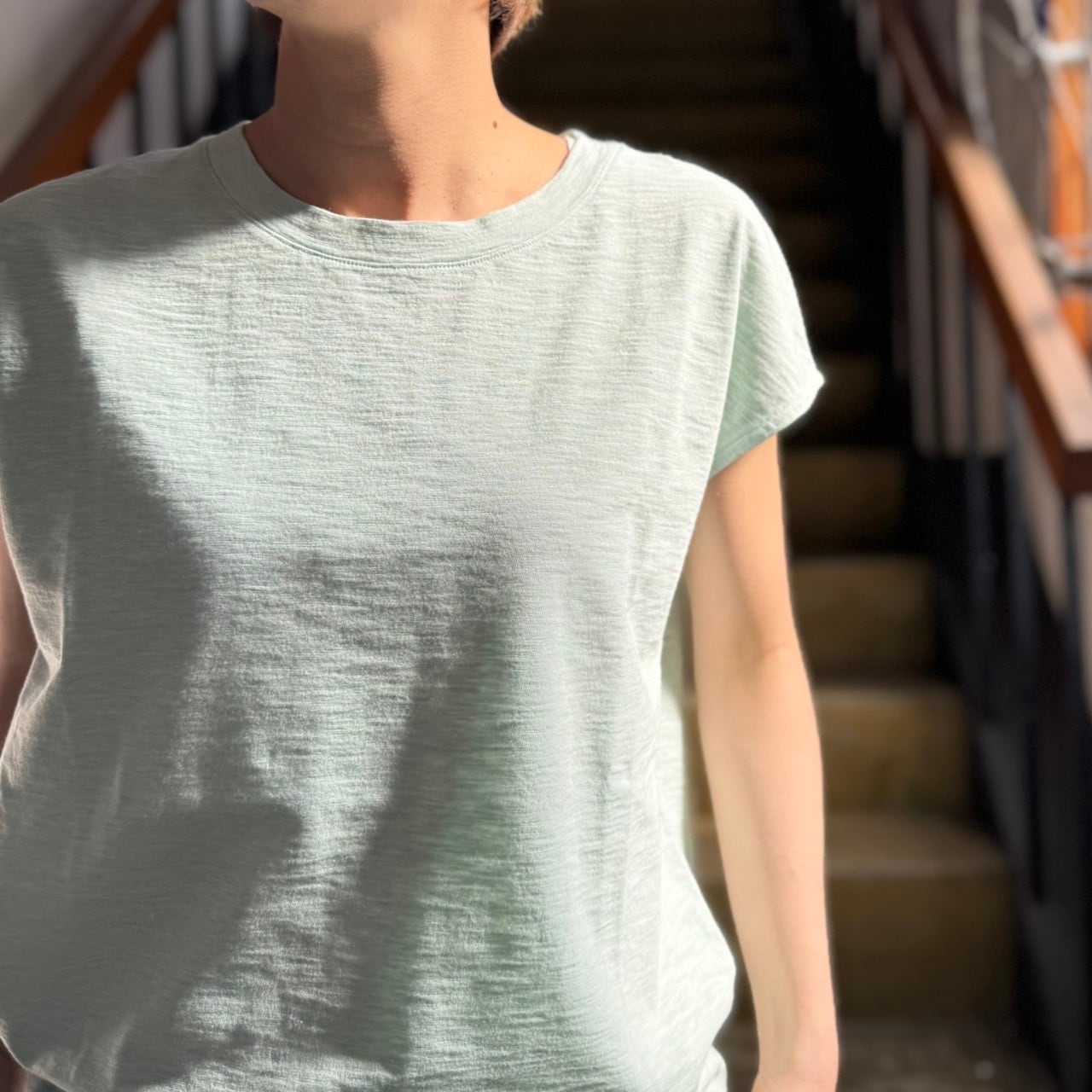 肩が隠れるくらいのフレンチスリーブでサラッと1枚で着ていただいても