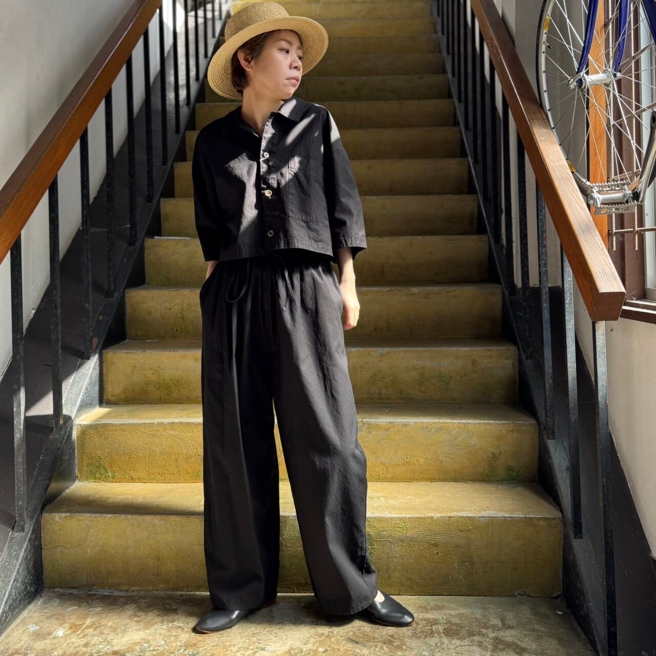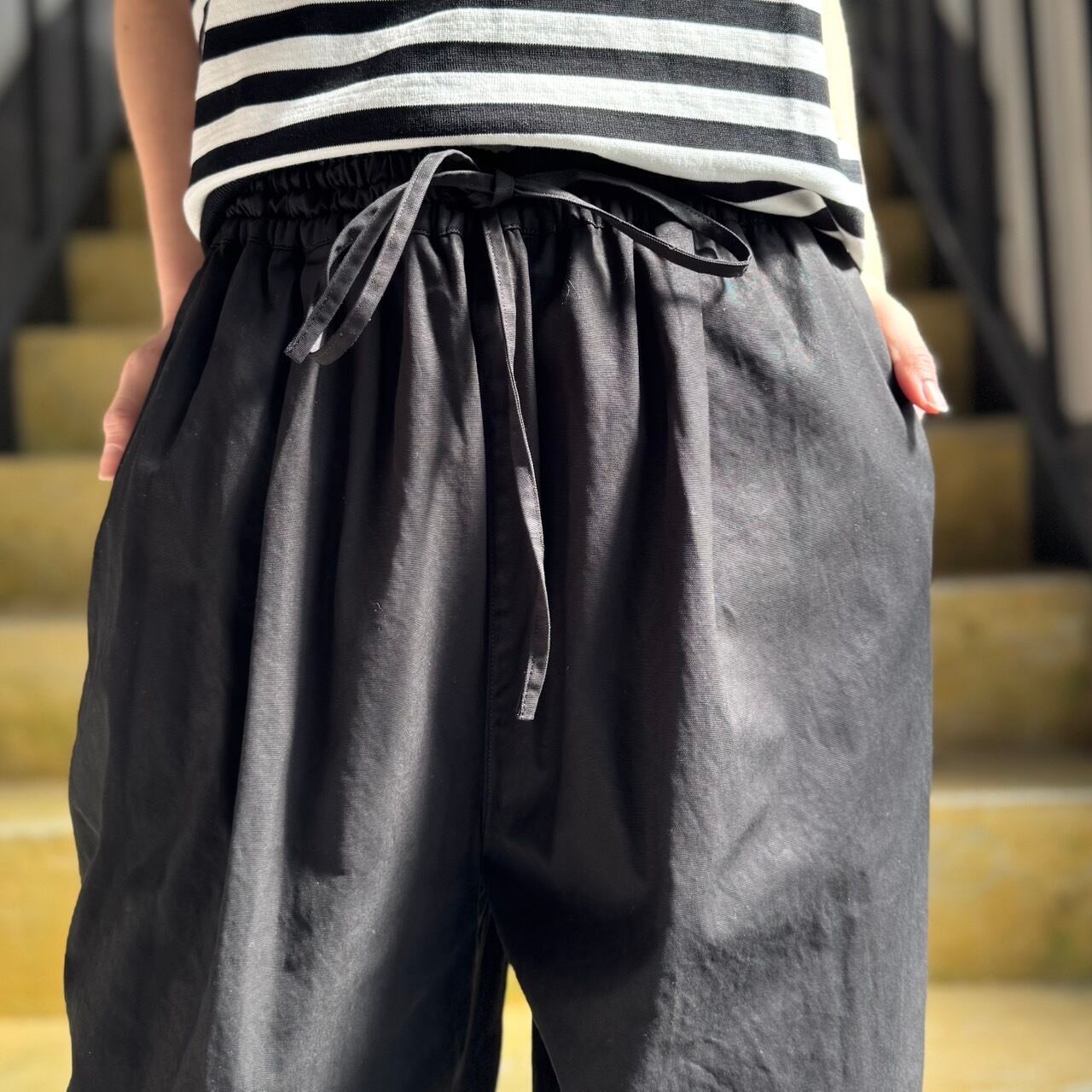 ペチパンツのようなラフさのあるイージーパンツを合わせた