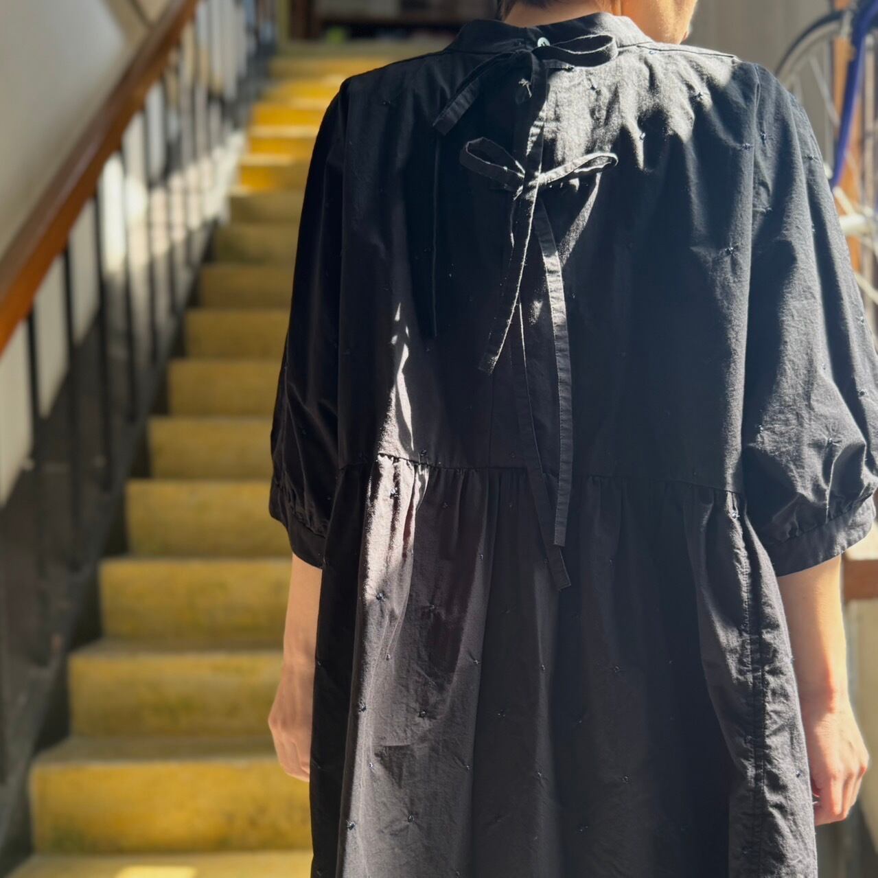 生成りにはシルバーのドット刺繍、ブラックにはネイビーのドット刺繍が入っています。