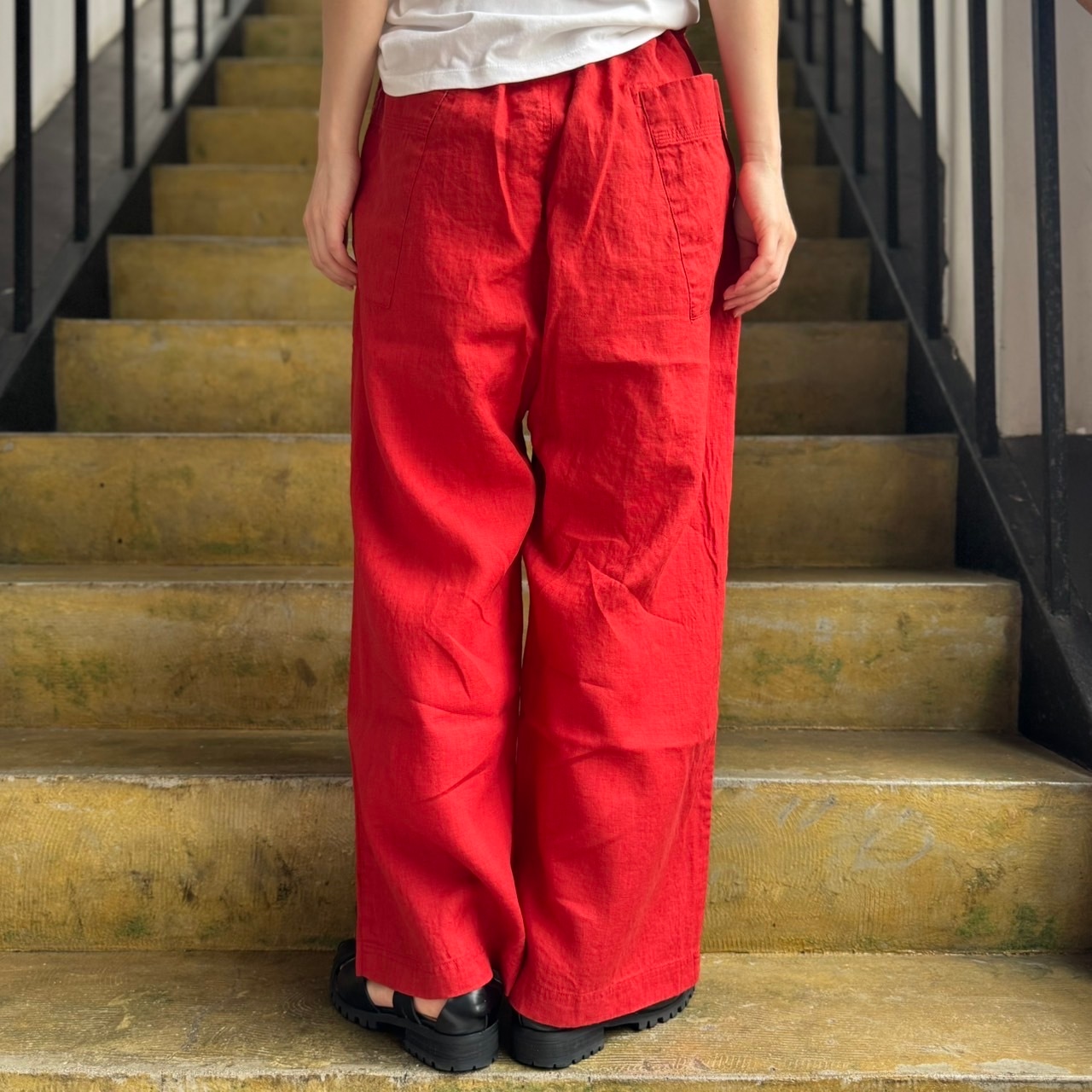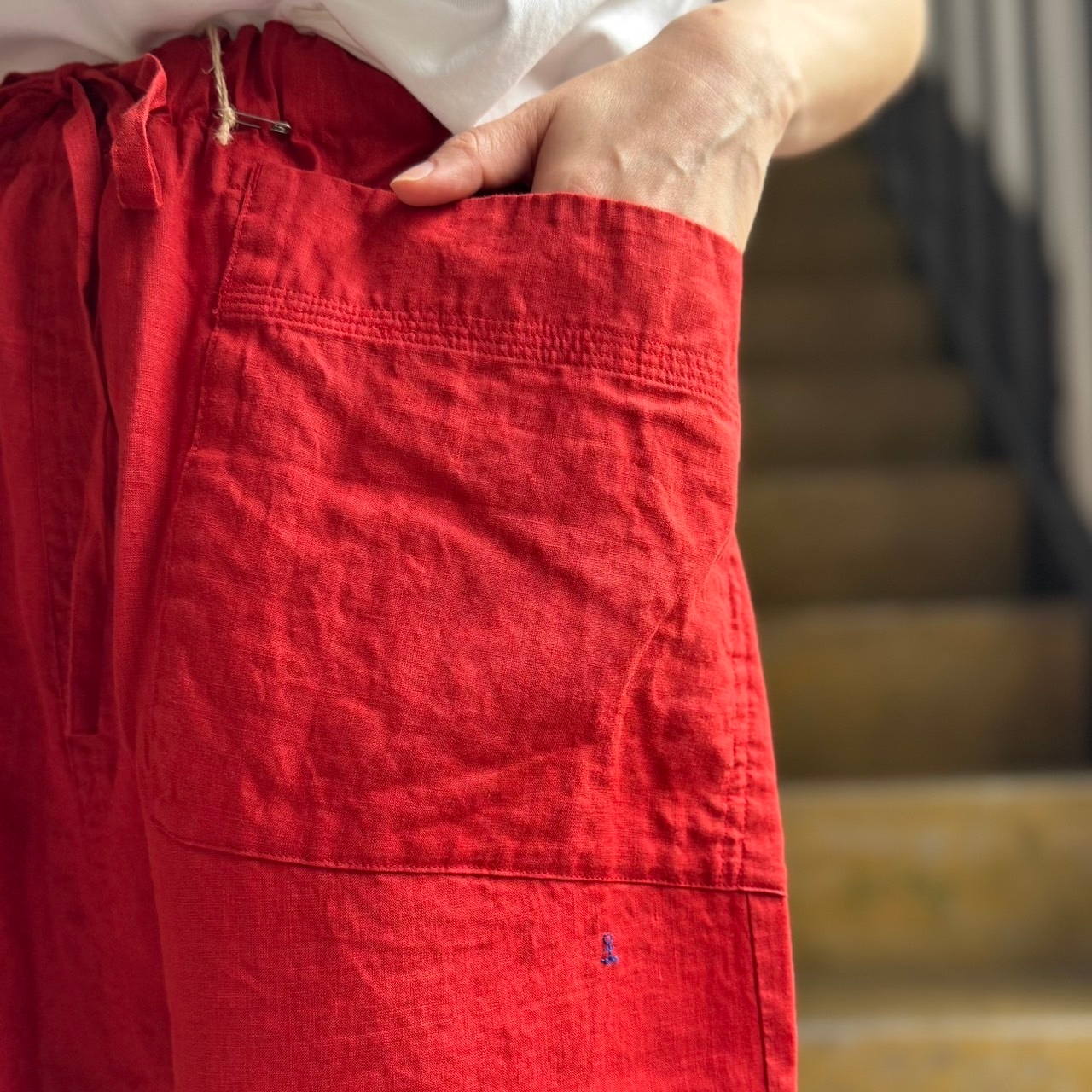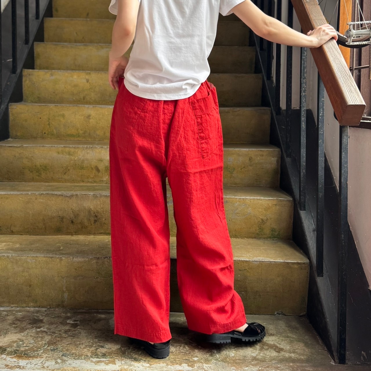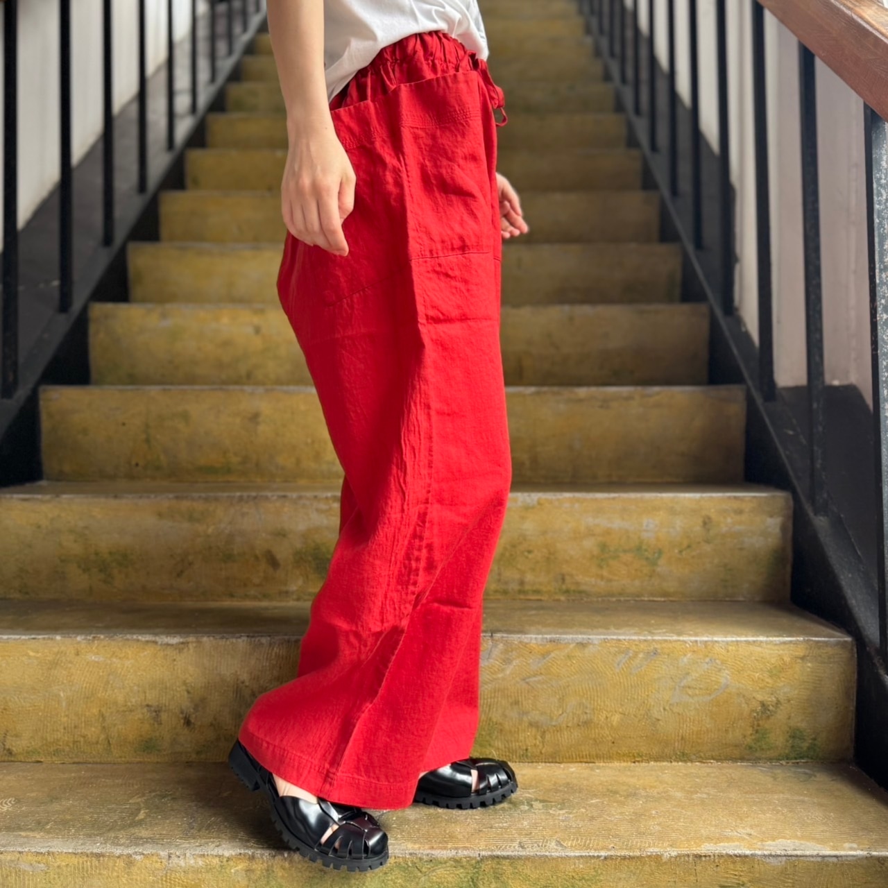 快晴堂 - 初秋まで着られるリネン/斜めポッケWideパンツ(レッド/ネイビー)