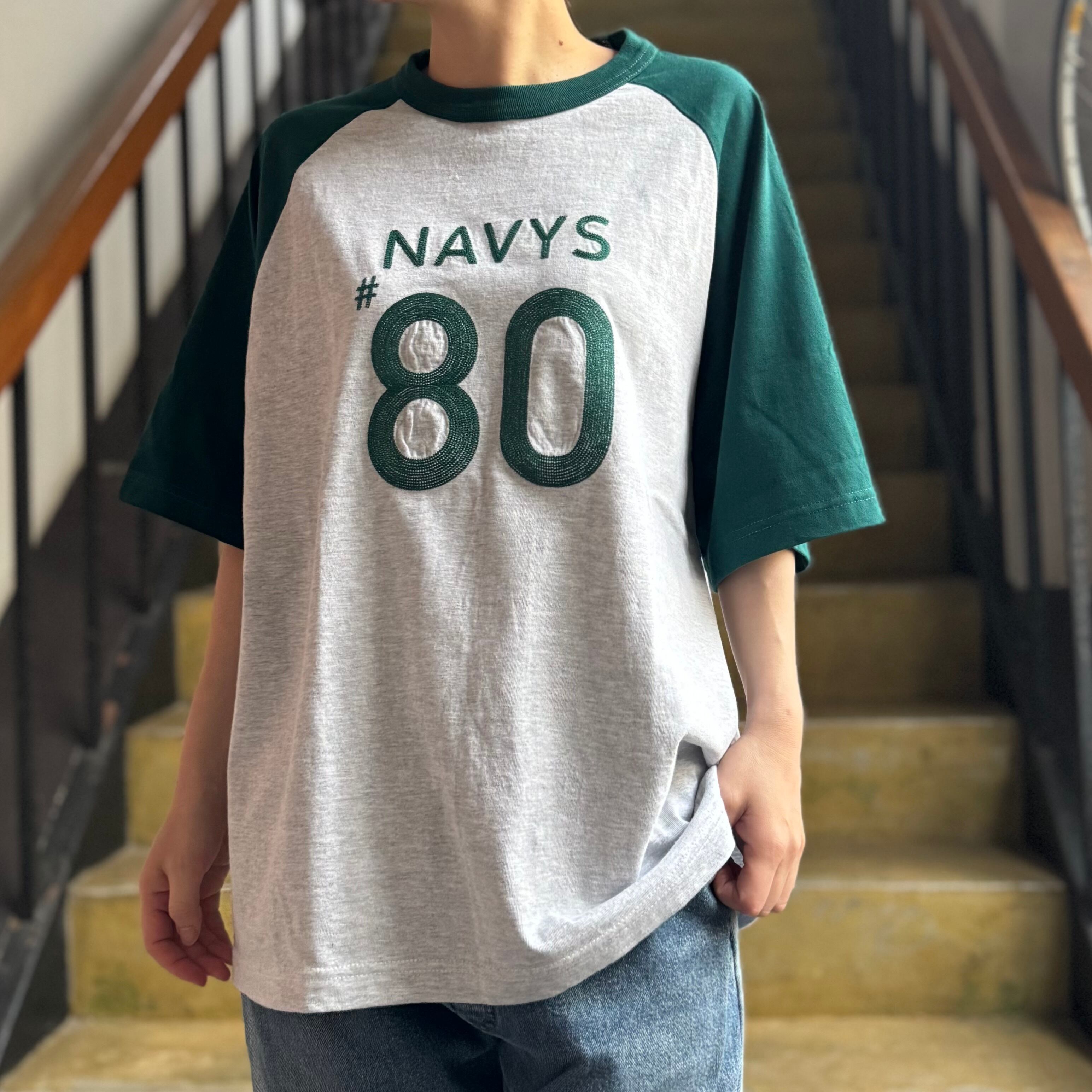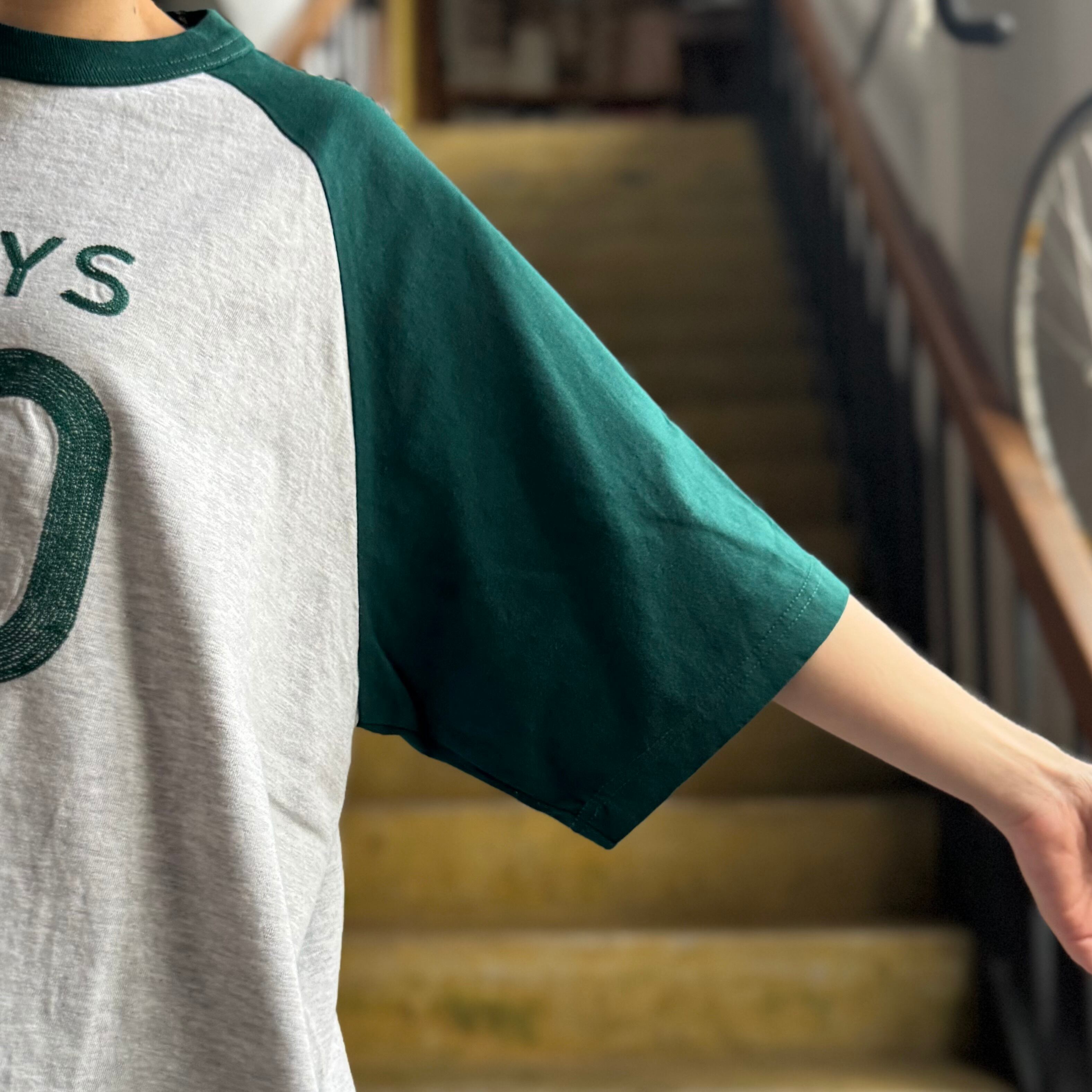 グレーベースにはグリーンの配色の袖と刺繍を施したPOPなTシャツとなっています。