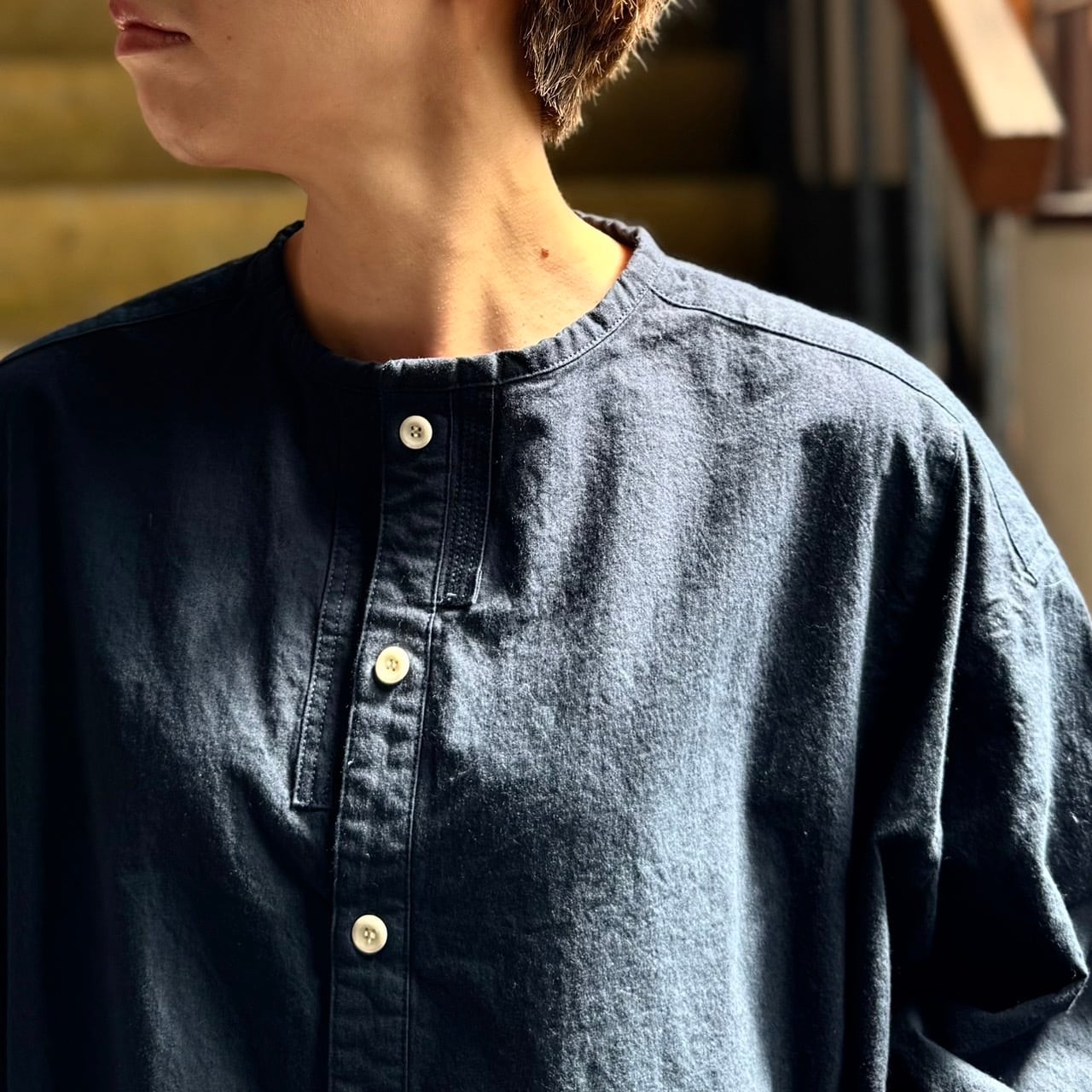 衿元がすっきりなスタンド衿タイプ。
