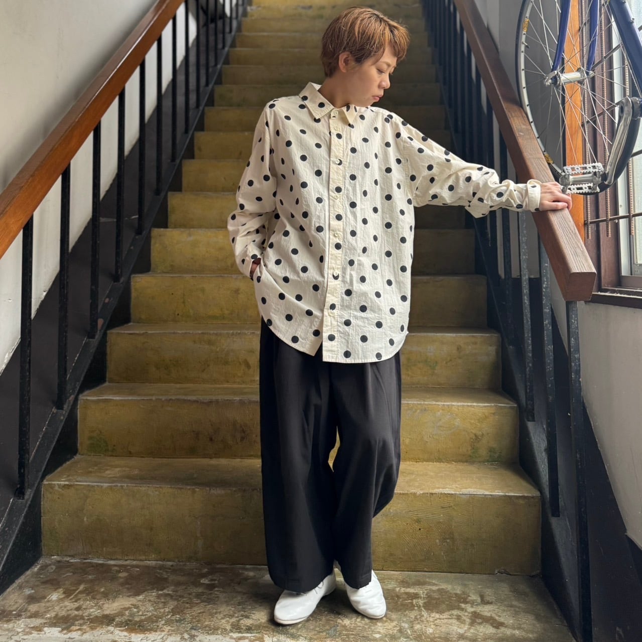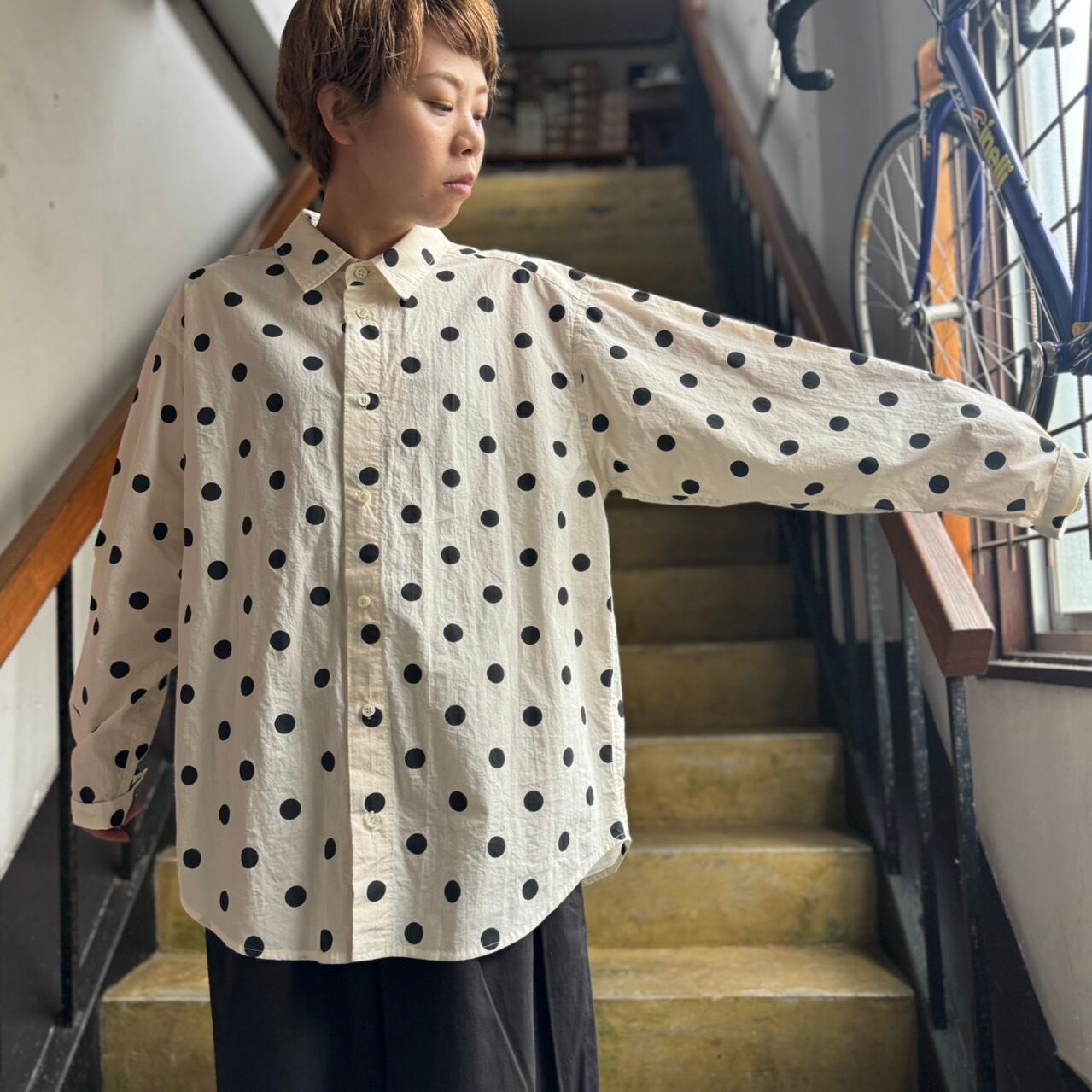 生成りベースのメンズライクなシャツ物にマットなドットプリントを載せた