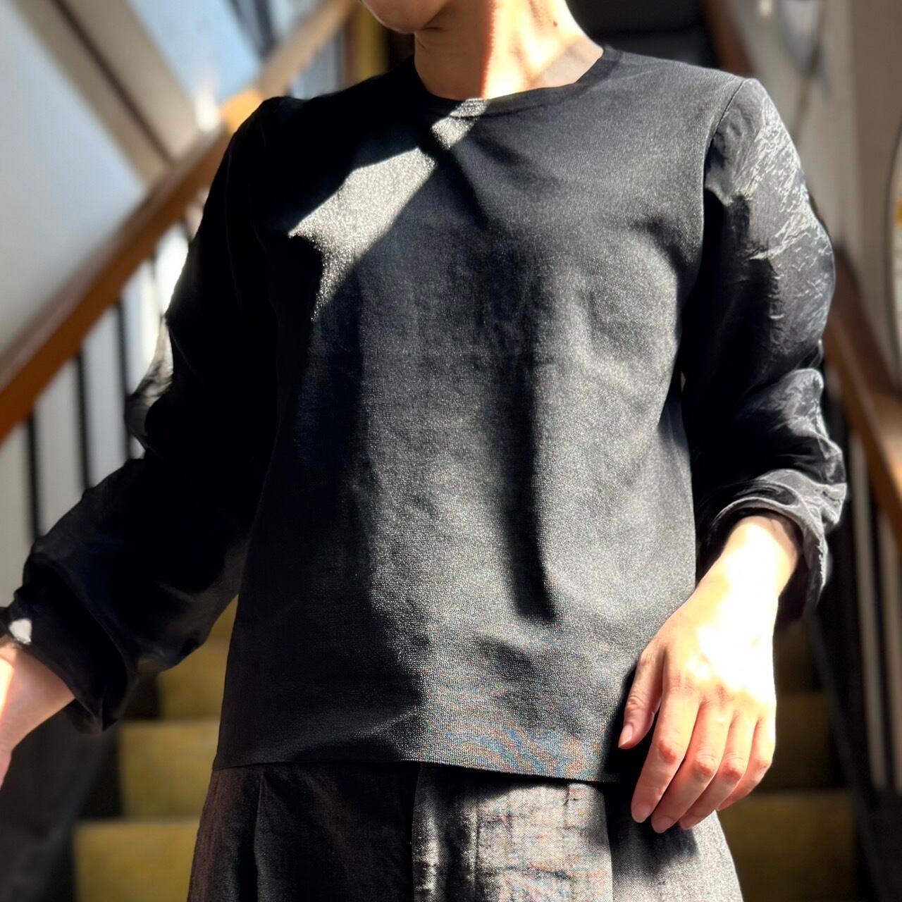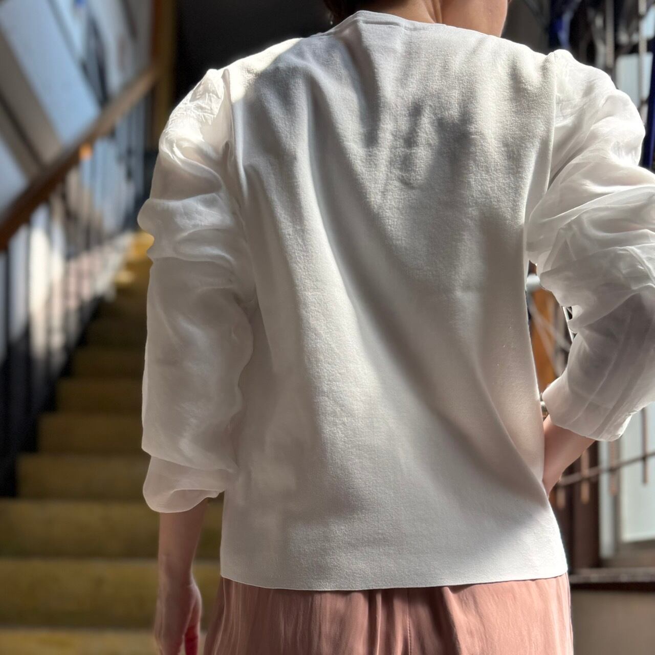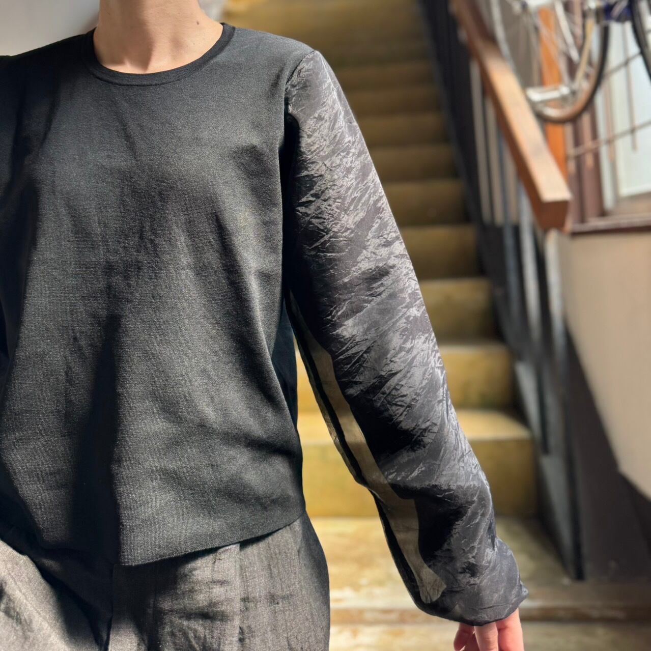 袖にシャイニーで透け感のあるオーガンジー袖をドッキングさせた