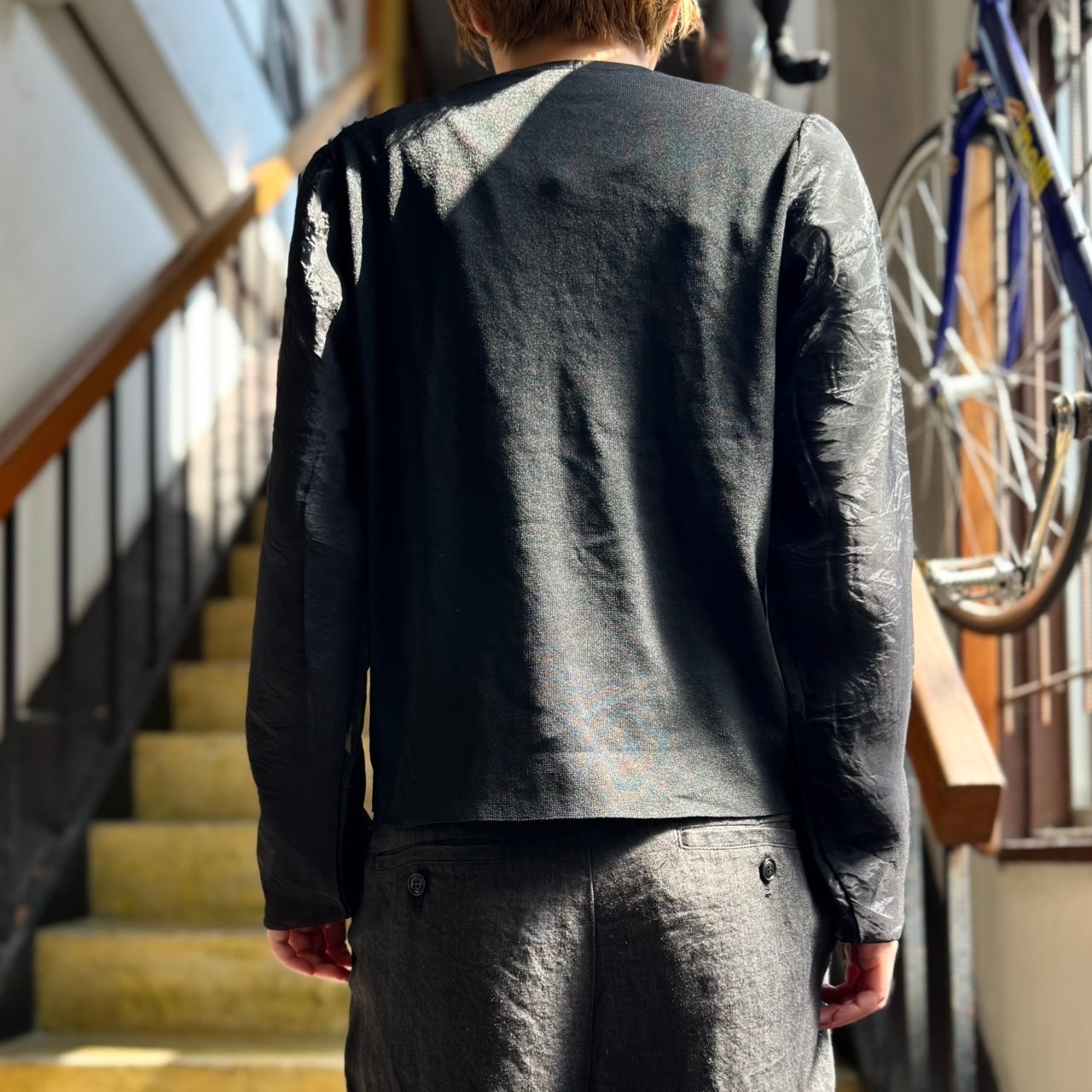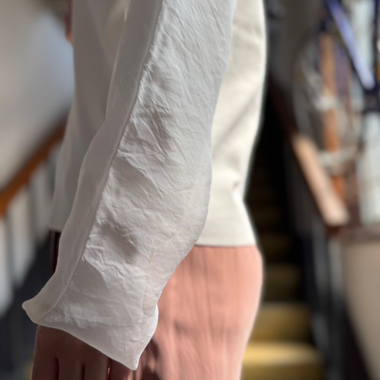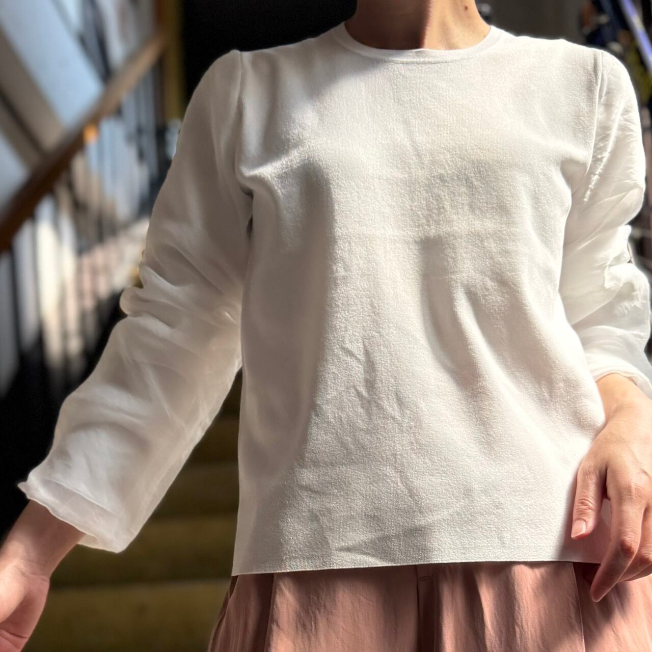 袖にシャイニーで透け感のあるオーガンジー袖をドッキングさせた