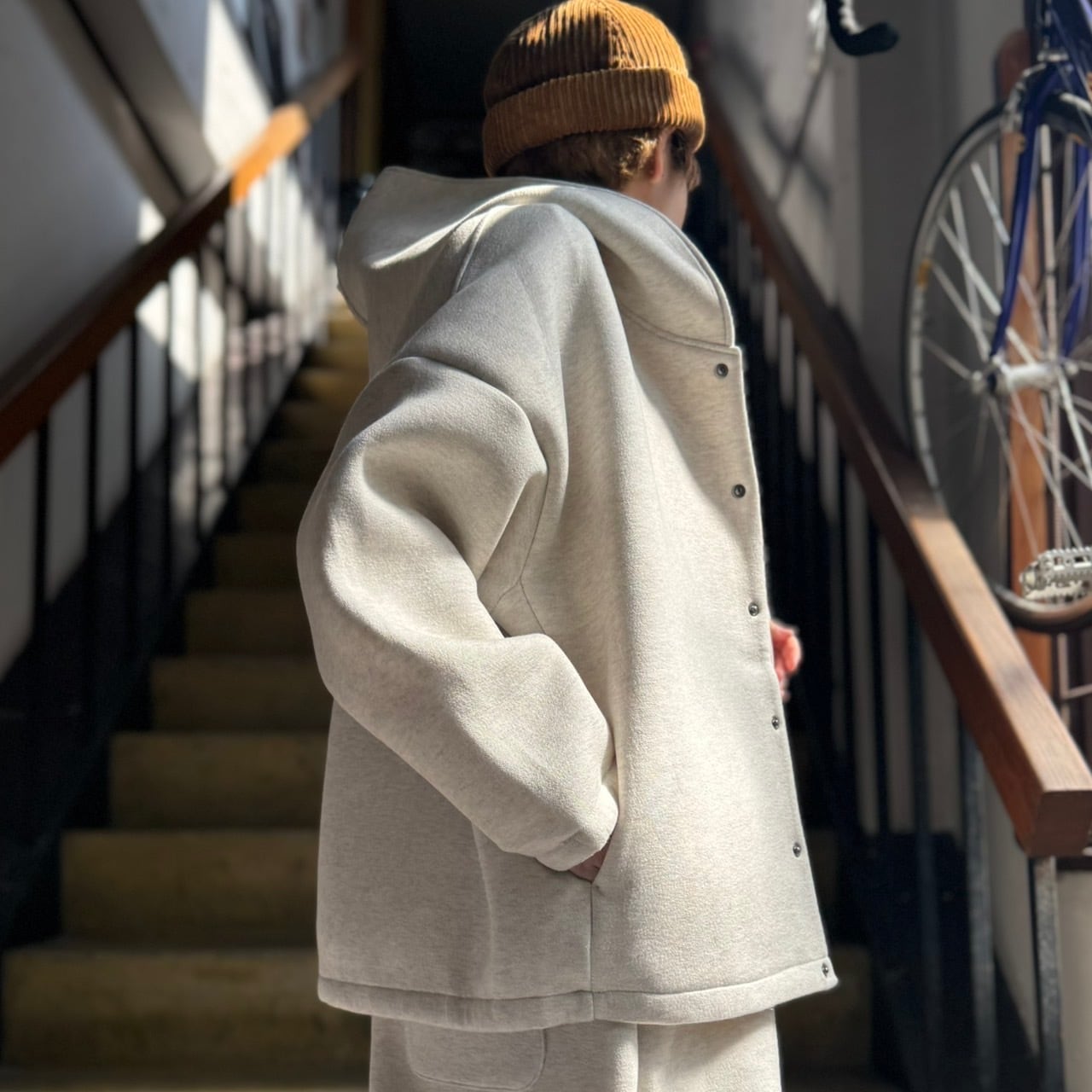 ハリ感と軽さが特徴的なダンボールニット素材によるフードジャケット✨