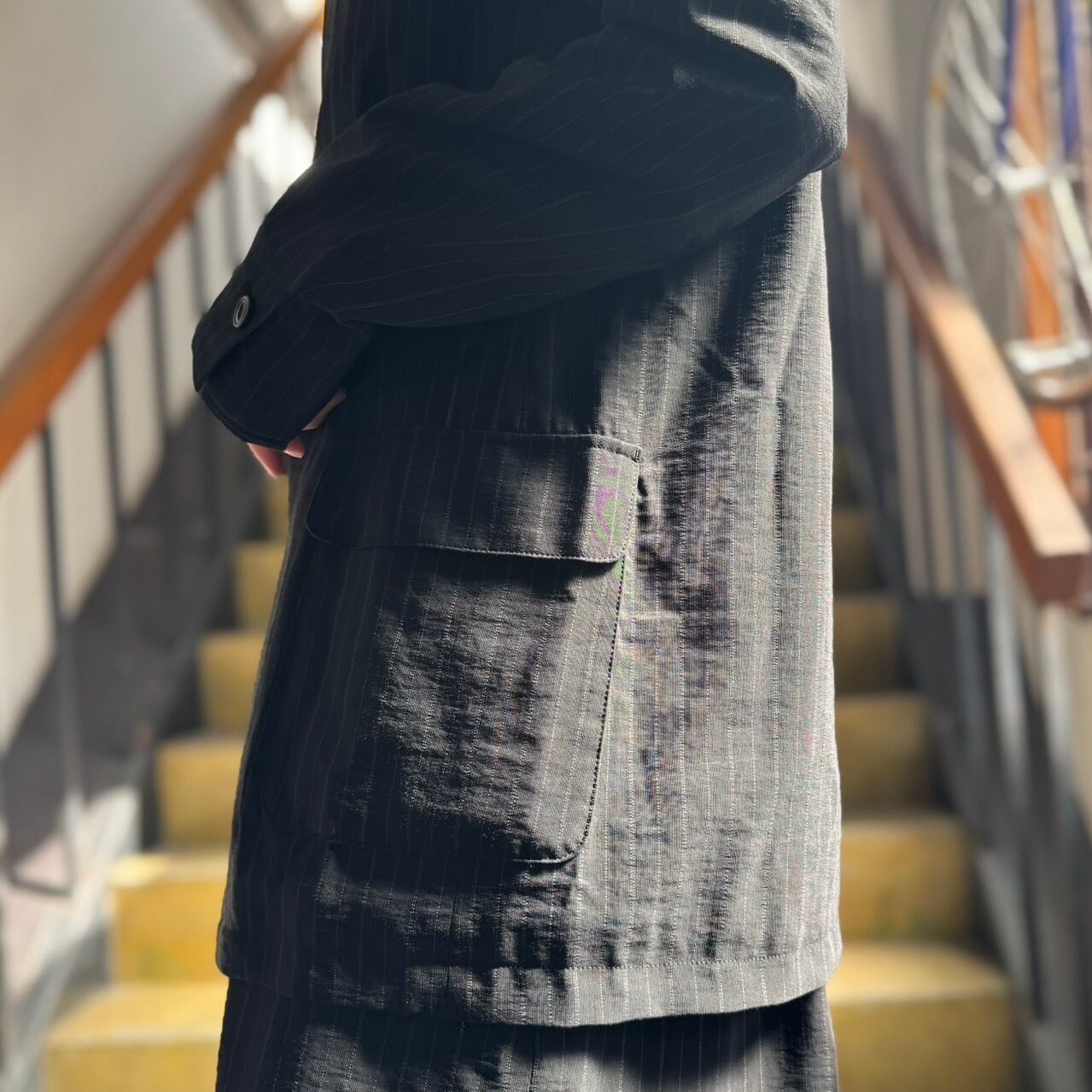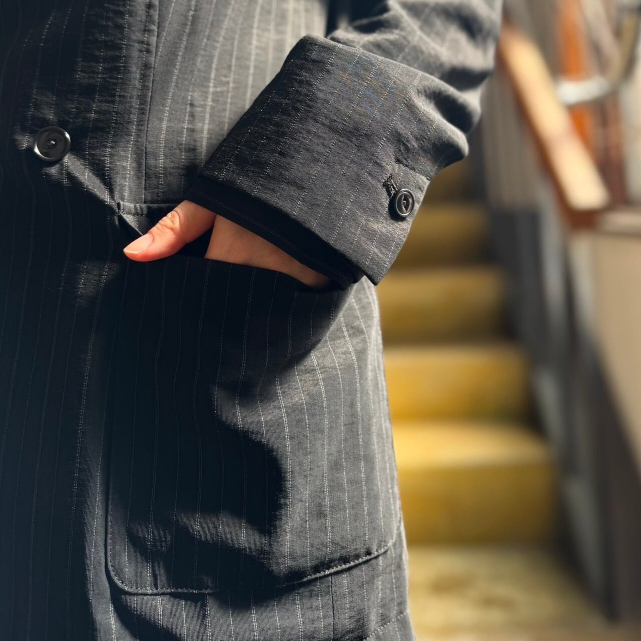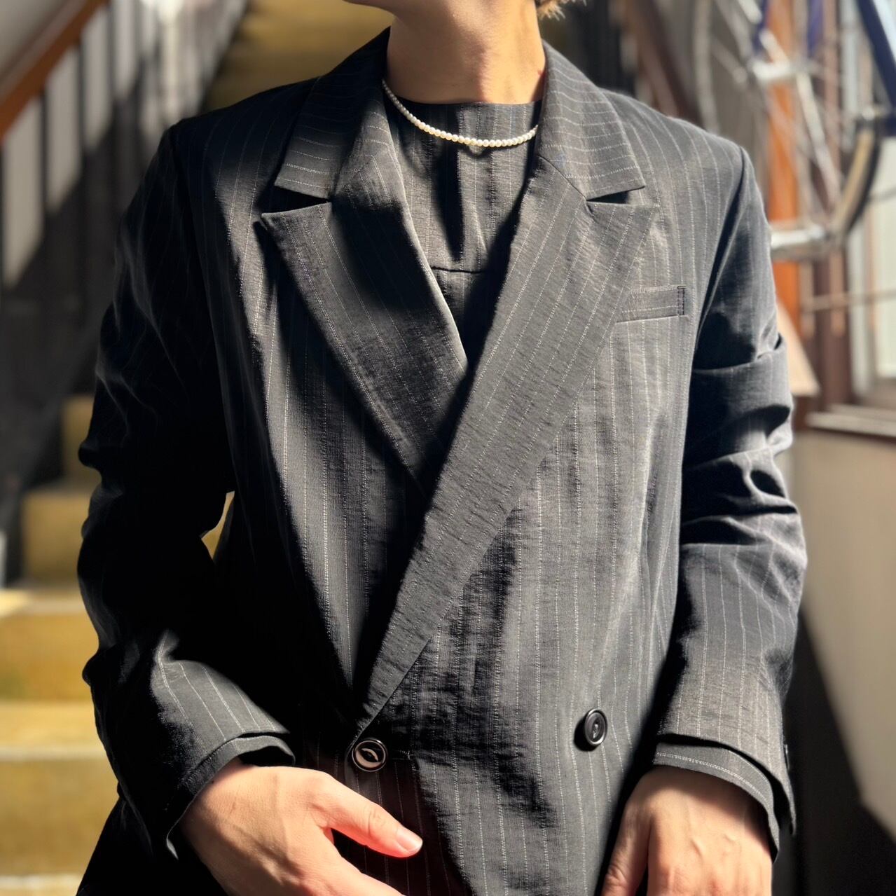 iki - レーヨンウールナイロン平織り ストライプダブルジャケット
