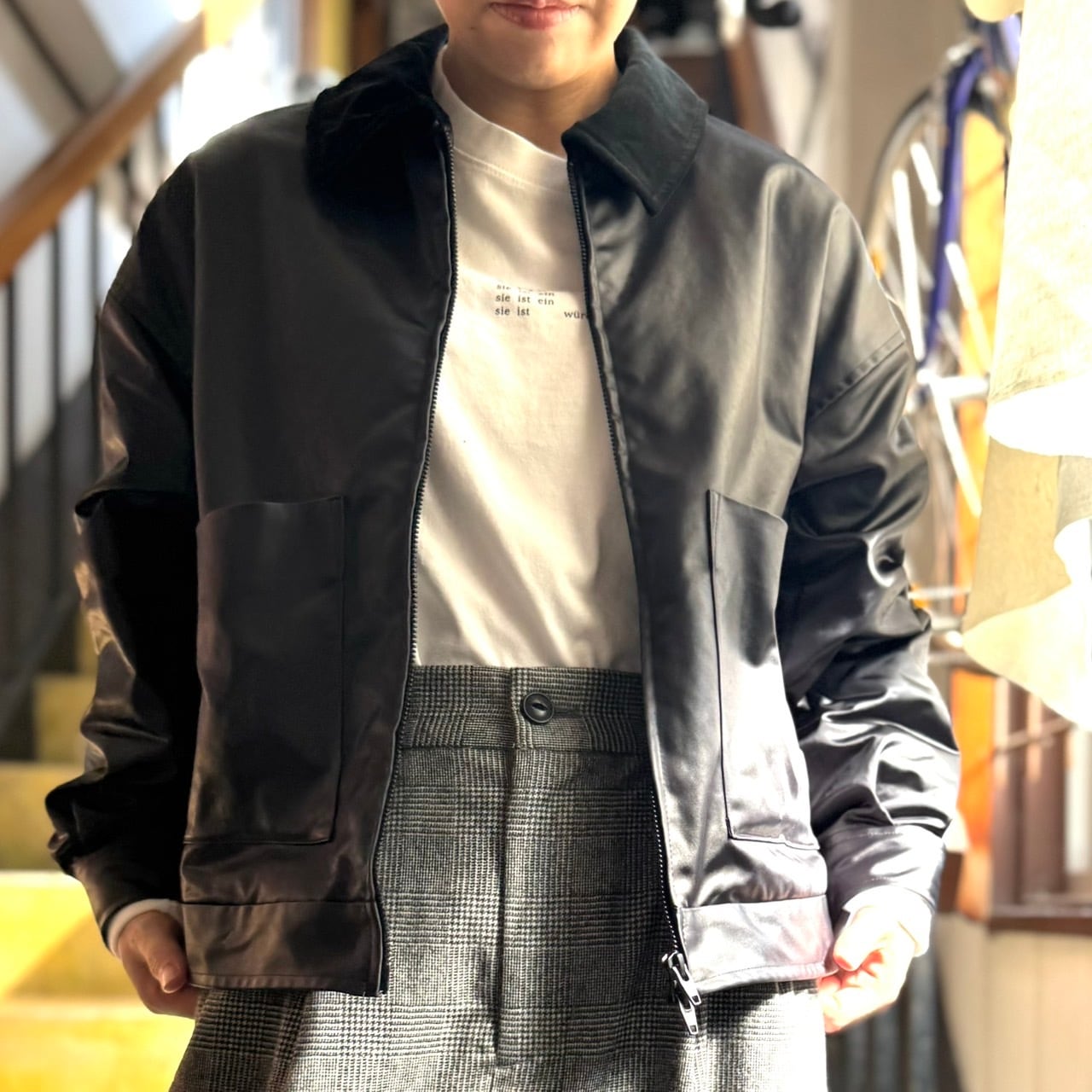 希少な中肉サテンのフェイクレザーブルゾン