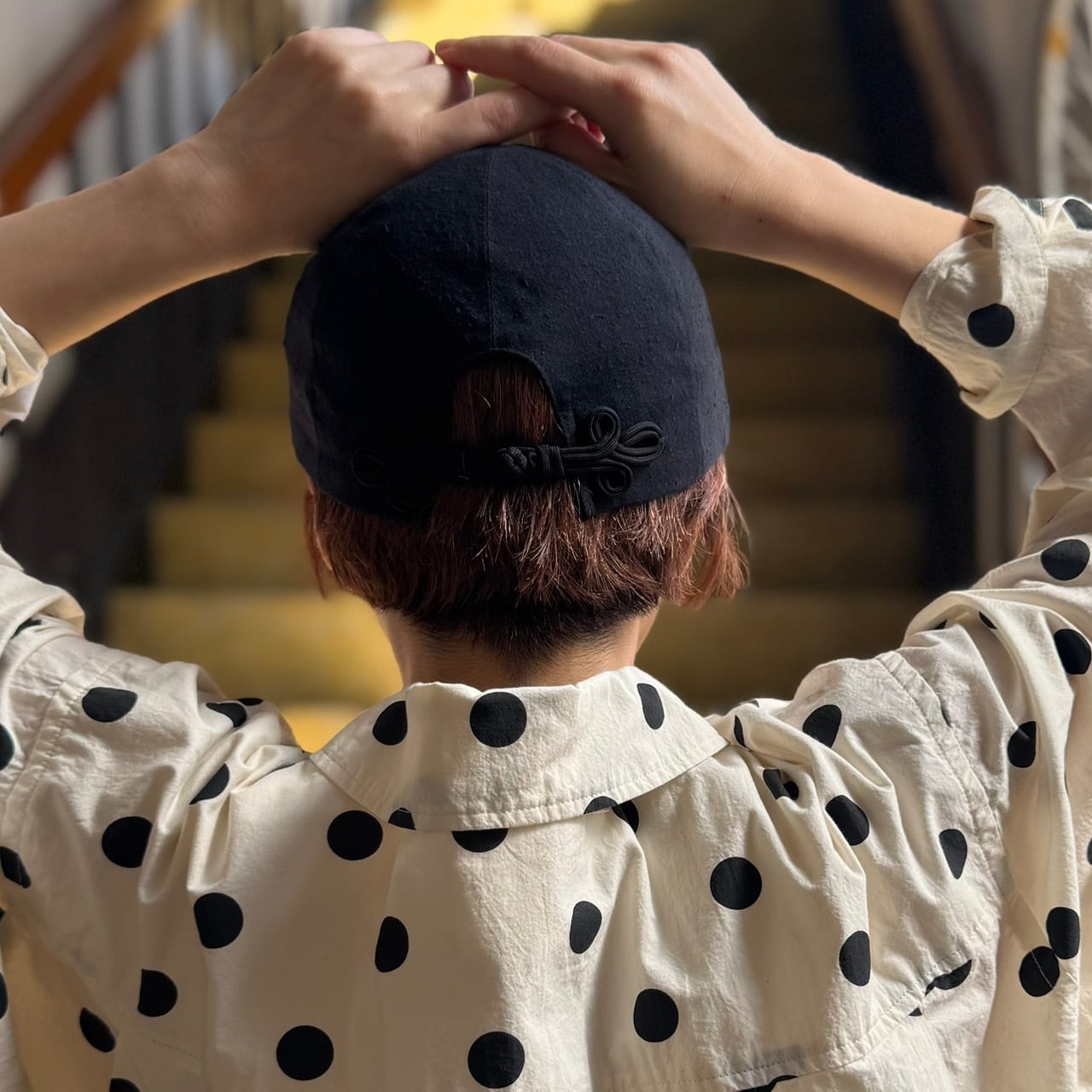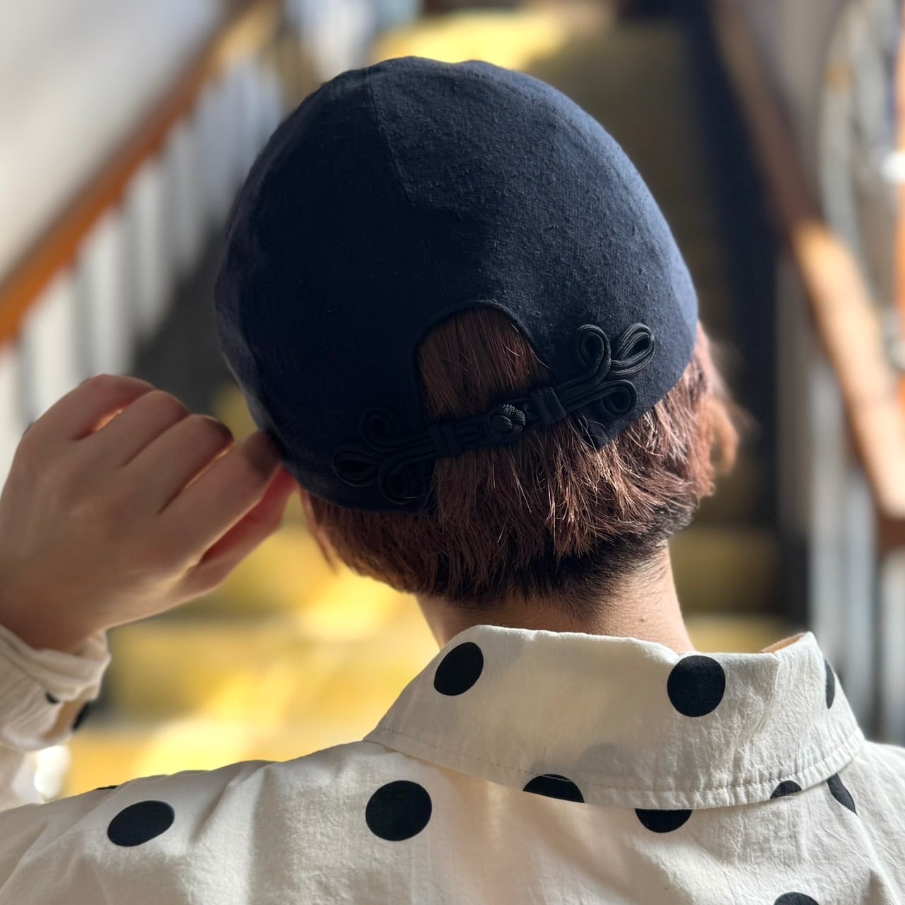 後ろの留め具がチャイナ釦になったひとクセ可愛いキャップとなっています。