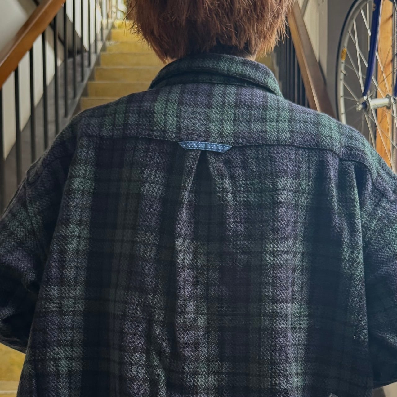 快晴堂 - Girl’sタータンチェック・リラクシンWork/アルピーノポケット羽織りシャツ(ブラックウォッチ)