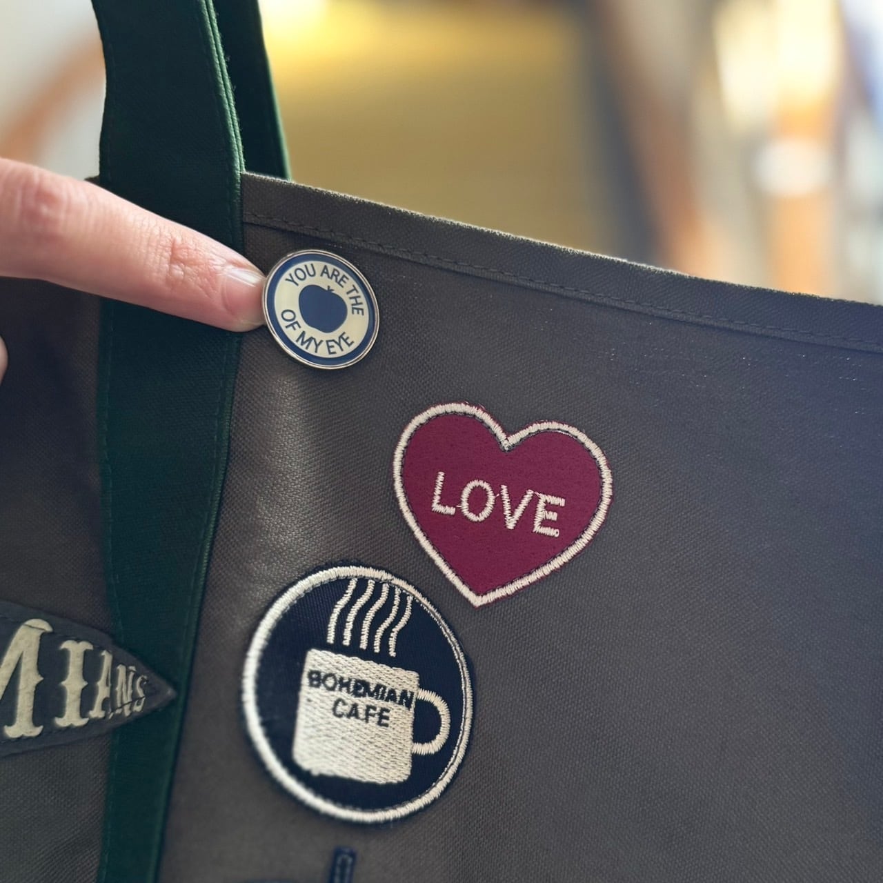 ピンバッジとオリジナルのワッペンをふんだんに取り付けたトートバッグです。