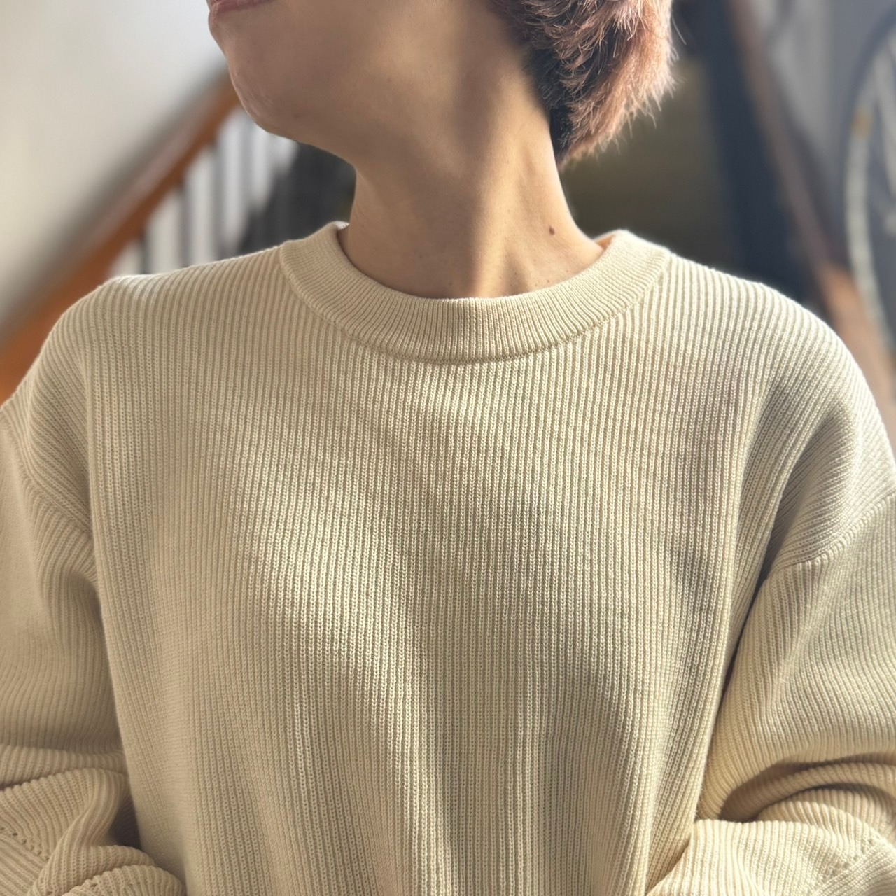 シンプルなデザインなので片畦編みで表情をプラスしたニットです。