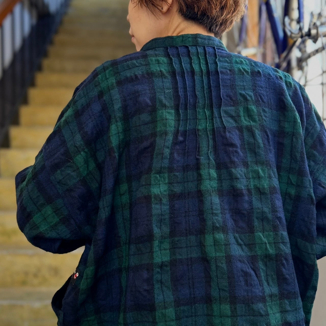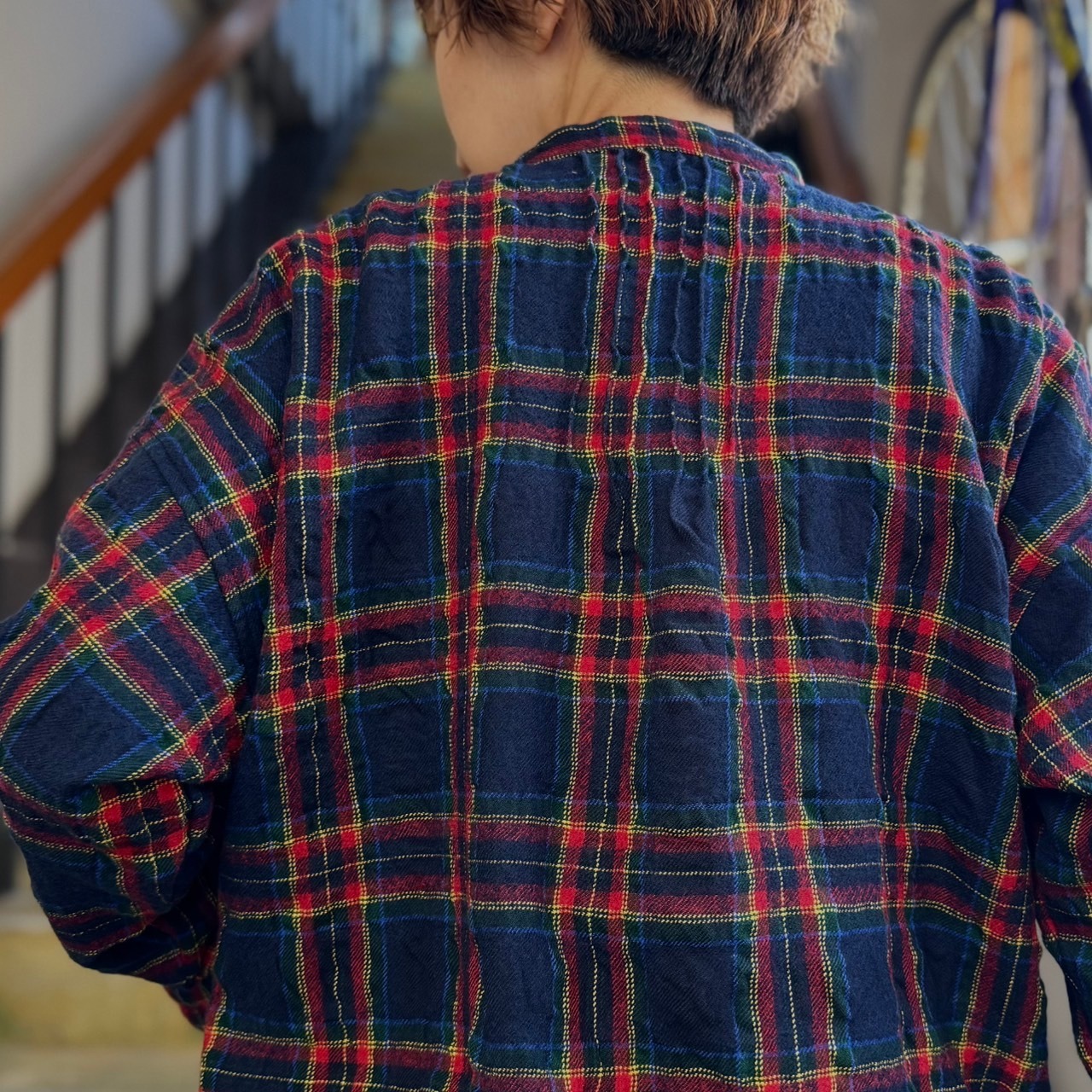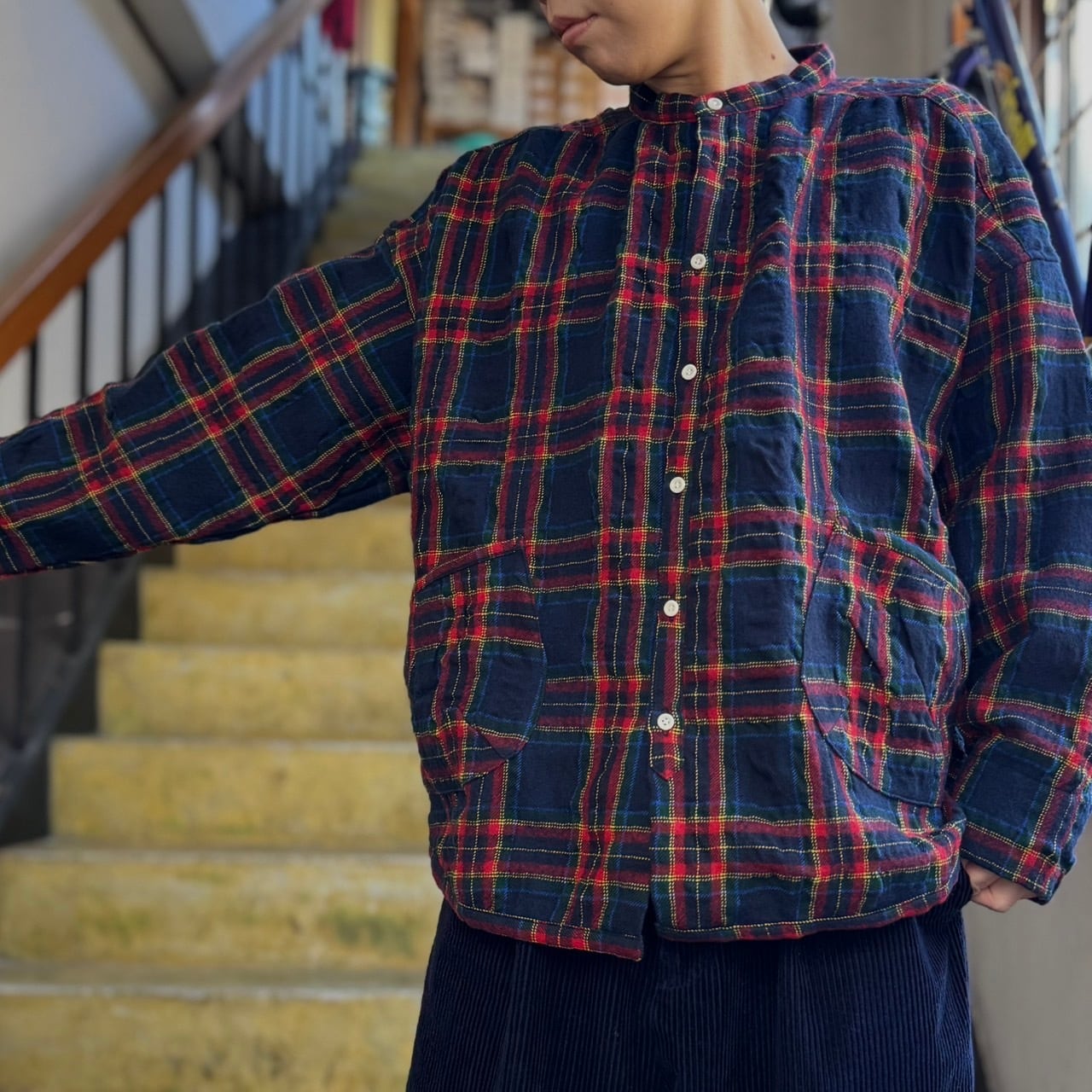 ちょっとした羽織りでも使えるポッケ付きのウールチェックのシャツ物。