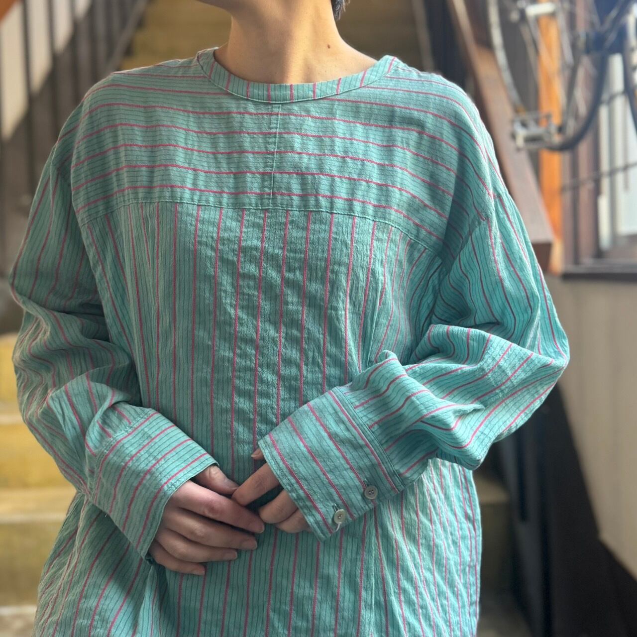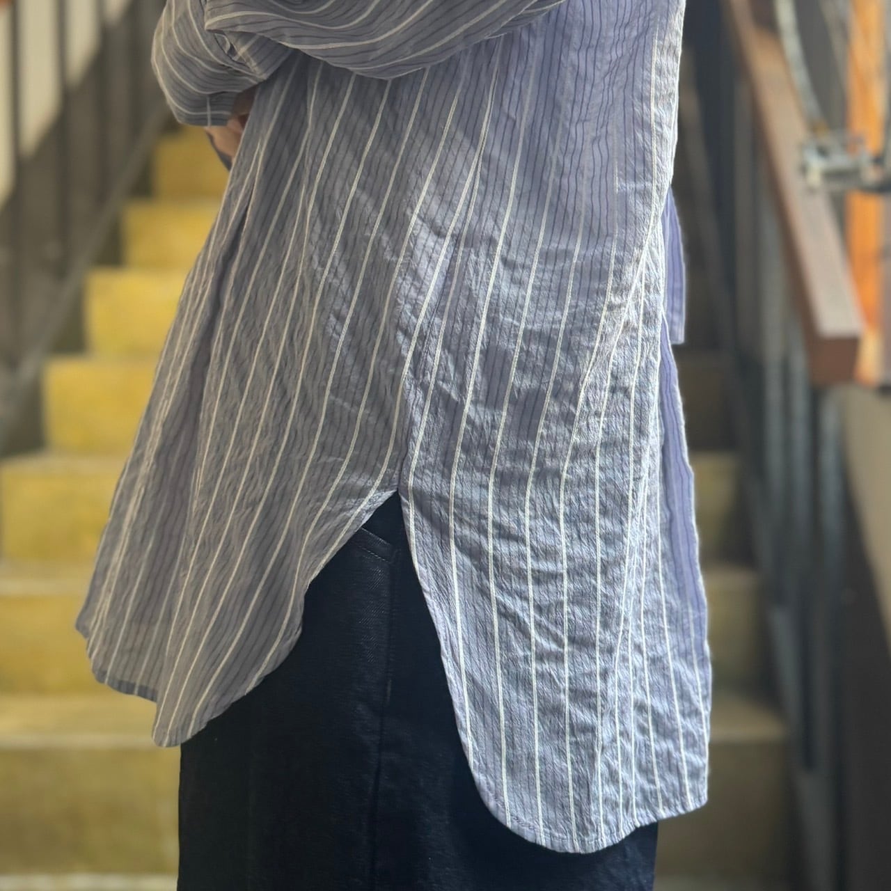 特別なストライプ素材を用いたノーカラーとスキッパーのデザインを