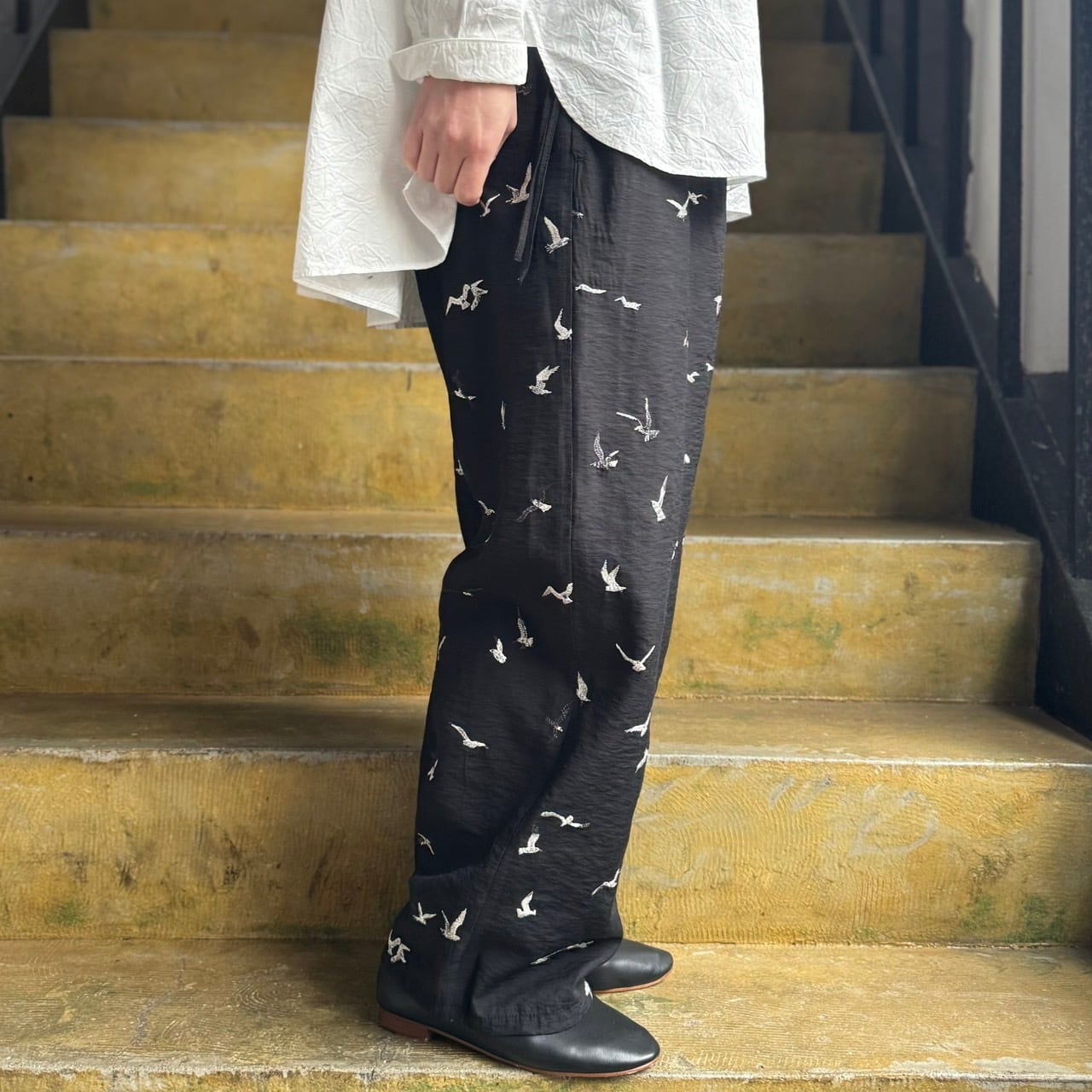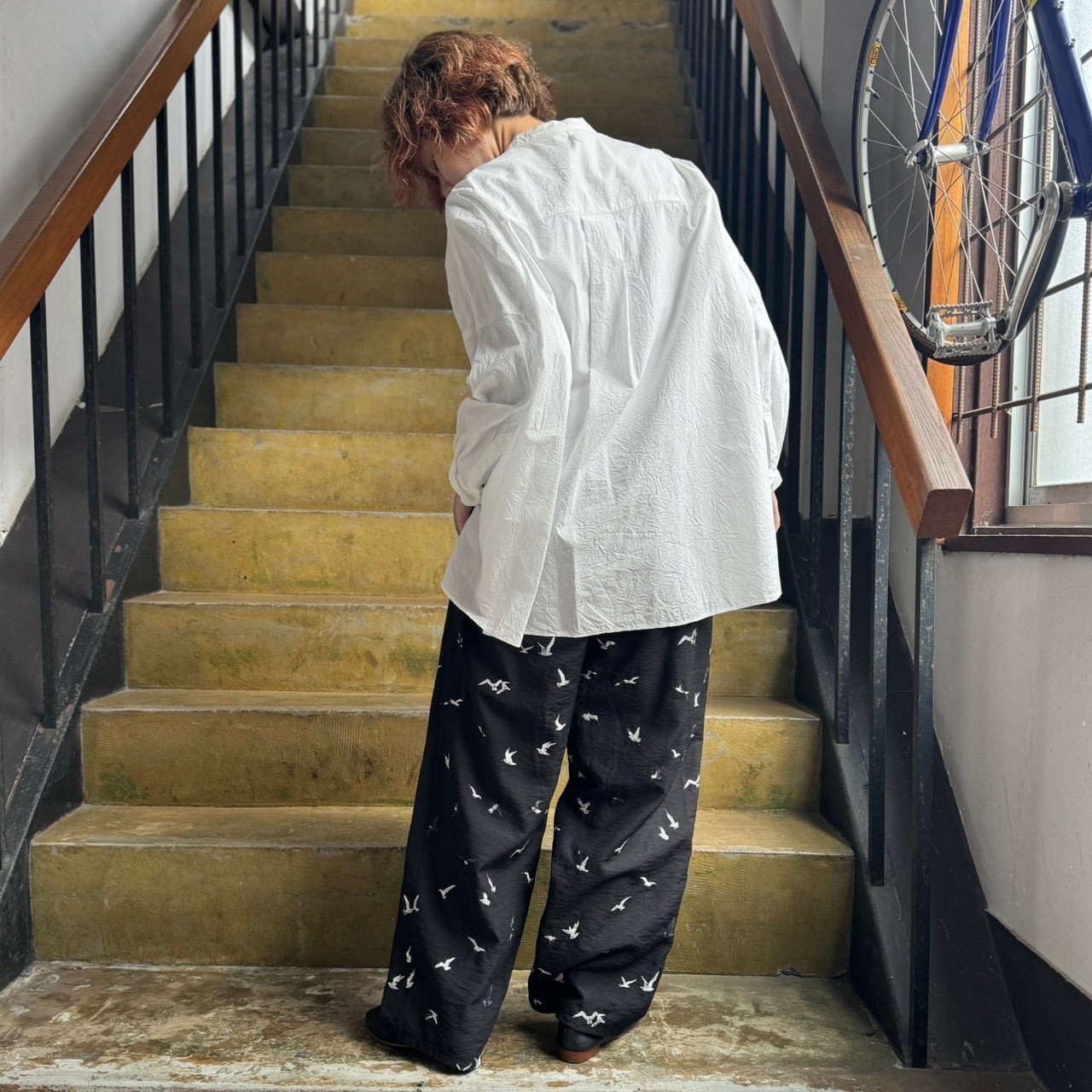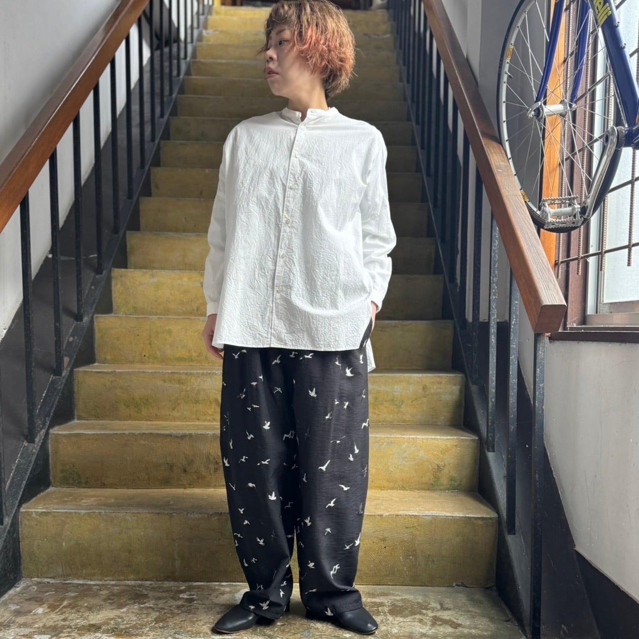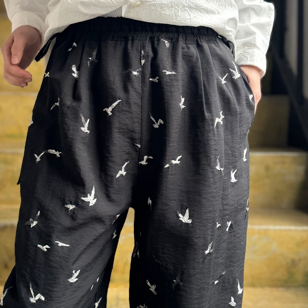 布の上に舞わせたイージースタイルのワイドパンツが入荷しています。