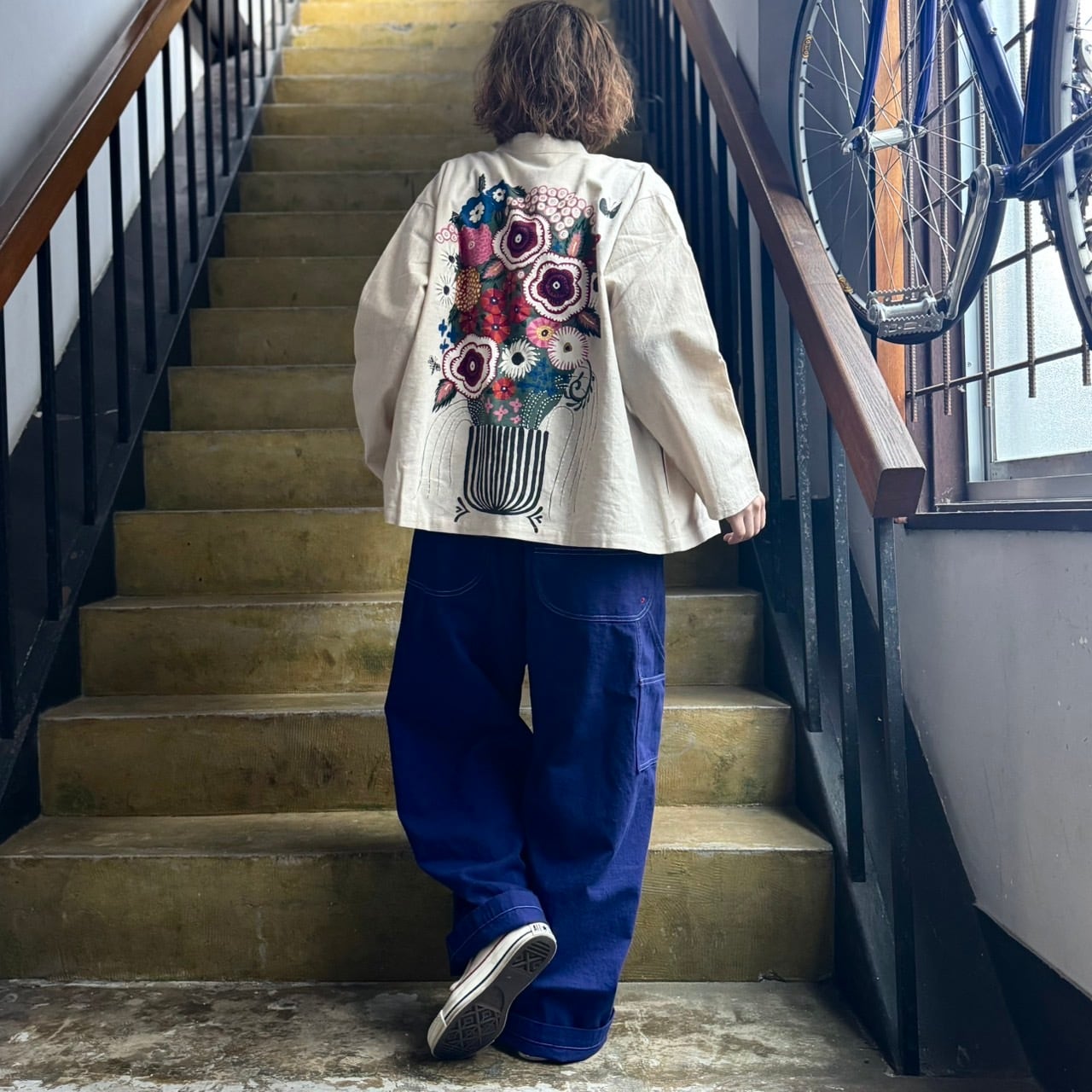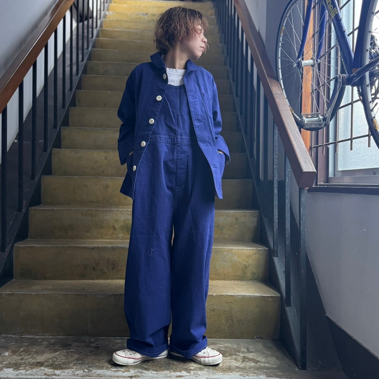 可愛さに仕上がったオーバーオールに同シリーズ、デッキジャケットを合わせた