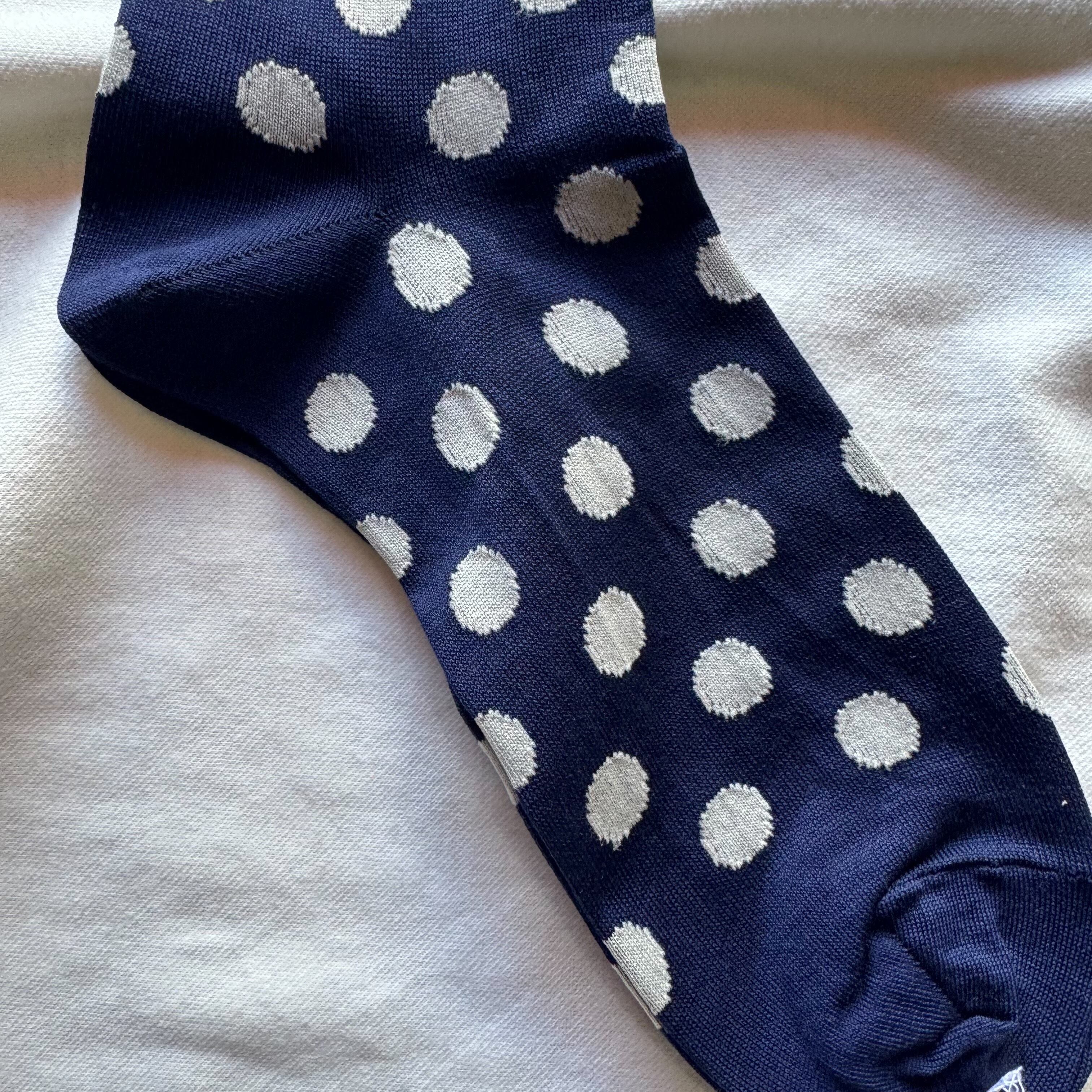 薄く編み立てたドット柄のソックスです。