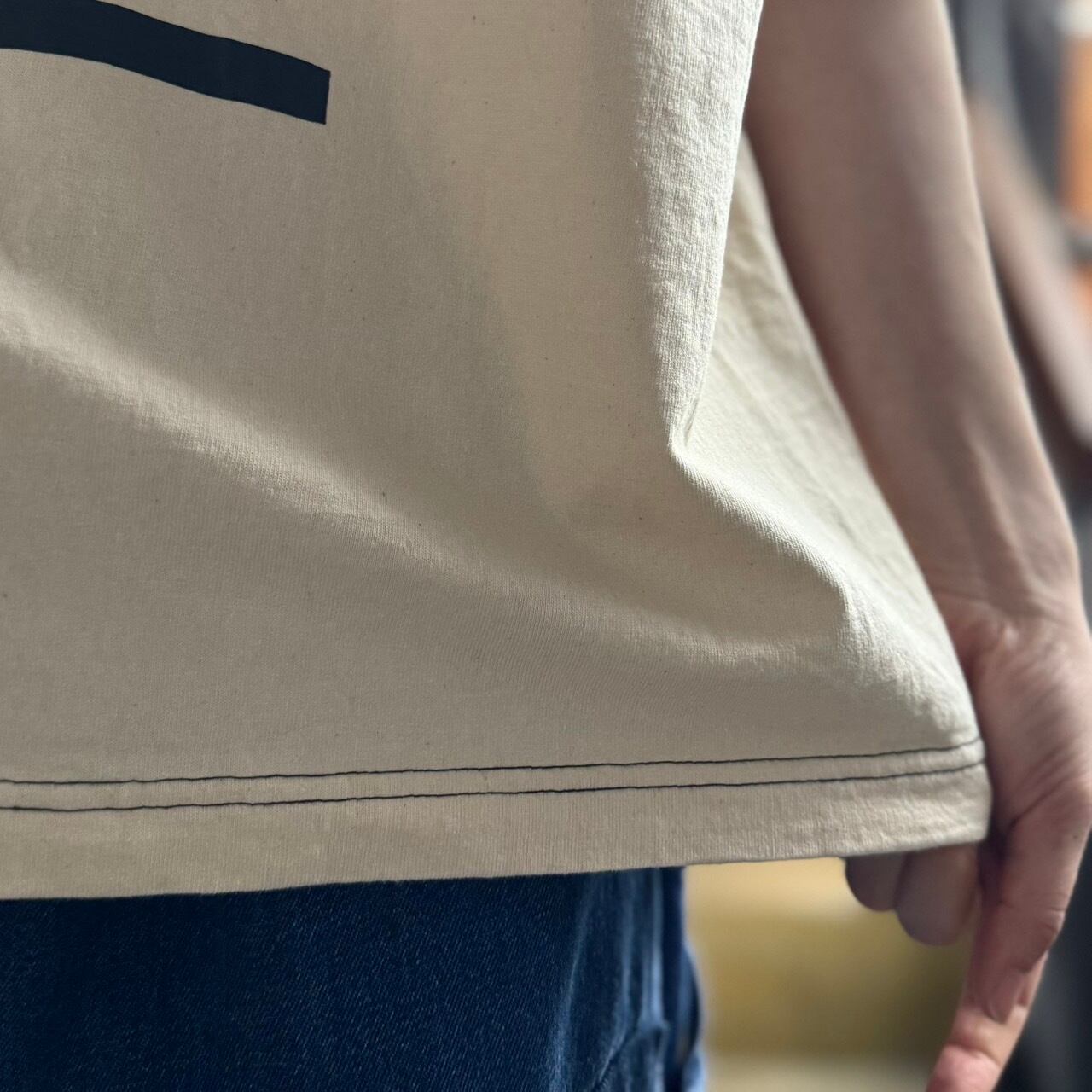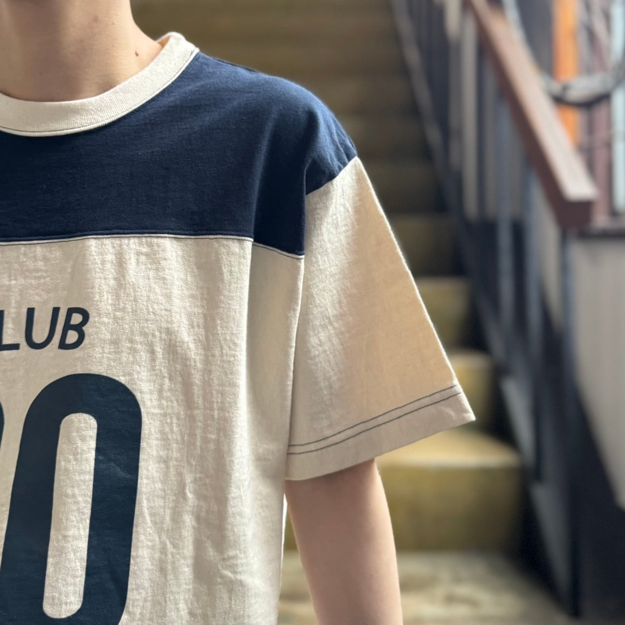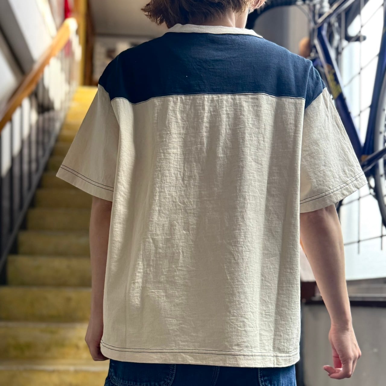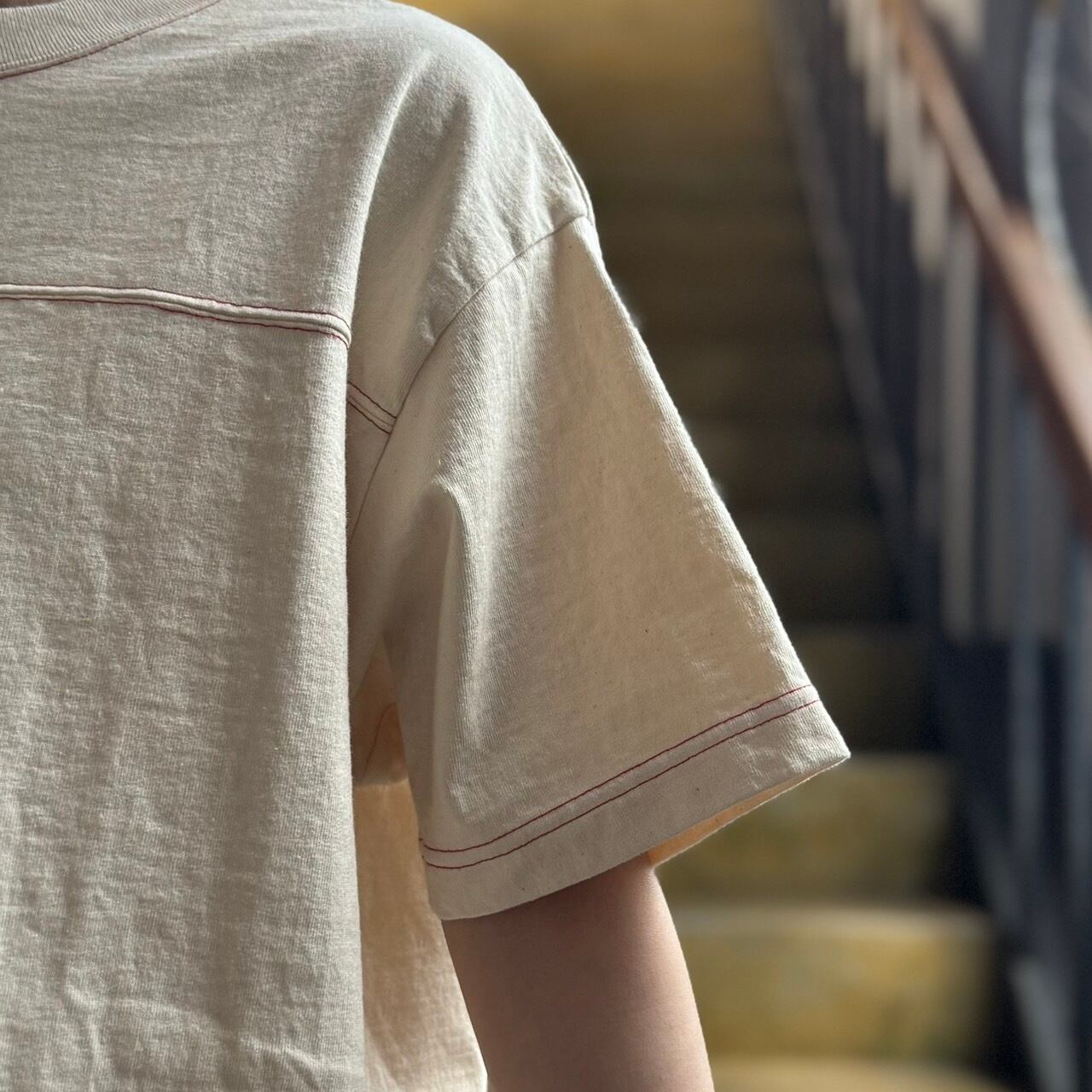 配色の2本針ステッチがどこか古着のような雰囲気を感じる