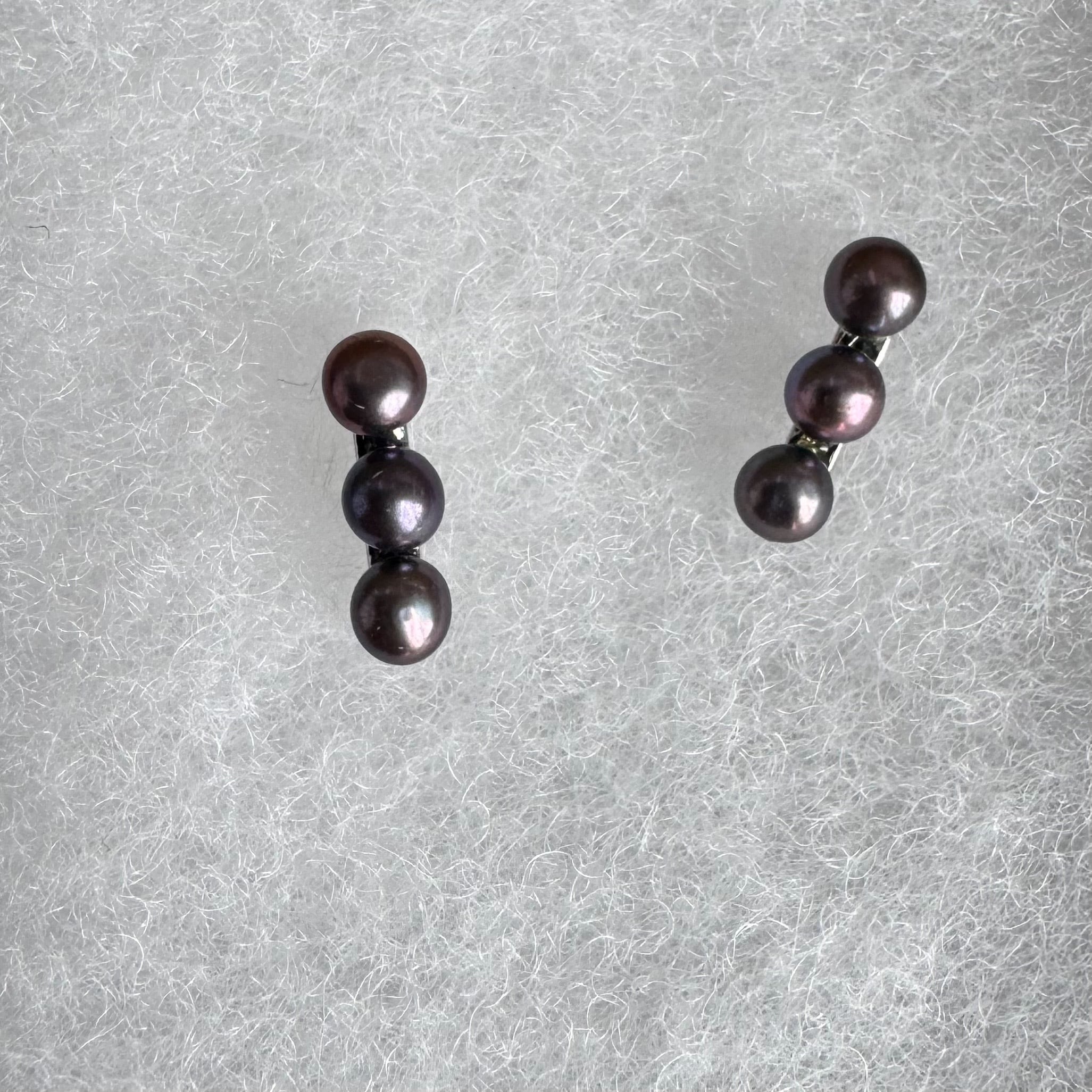 もち型と呼ばれるボタンのような形の高さのない淡水パールを3粒連ねた