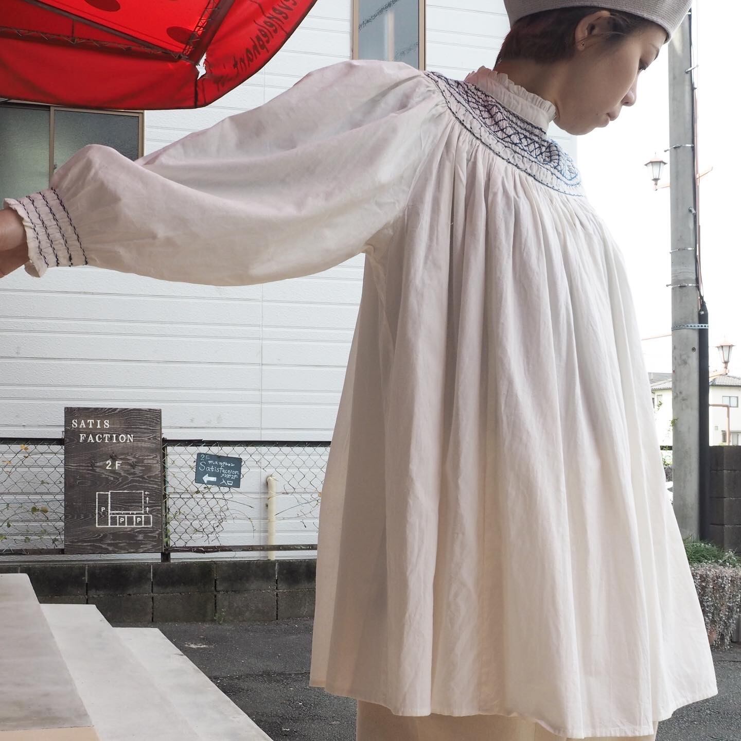 ハンド刺繍された細かい編みのハンドスモッキングのやや長めなチュニック丈ブラウス。