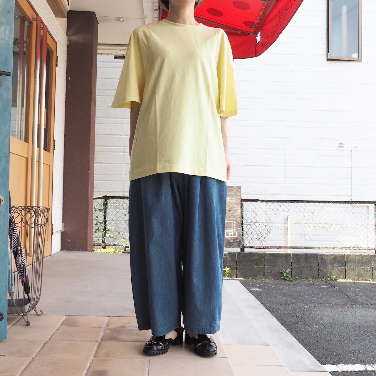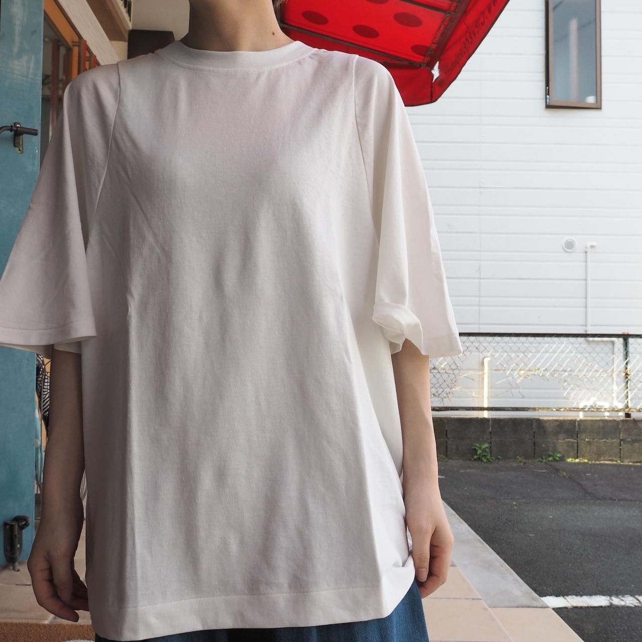 ハイト天竺の弾力さととろみ感を生かしたフレア袖のTシャツも