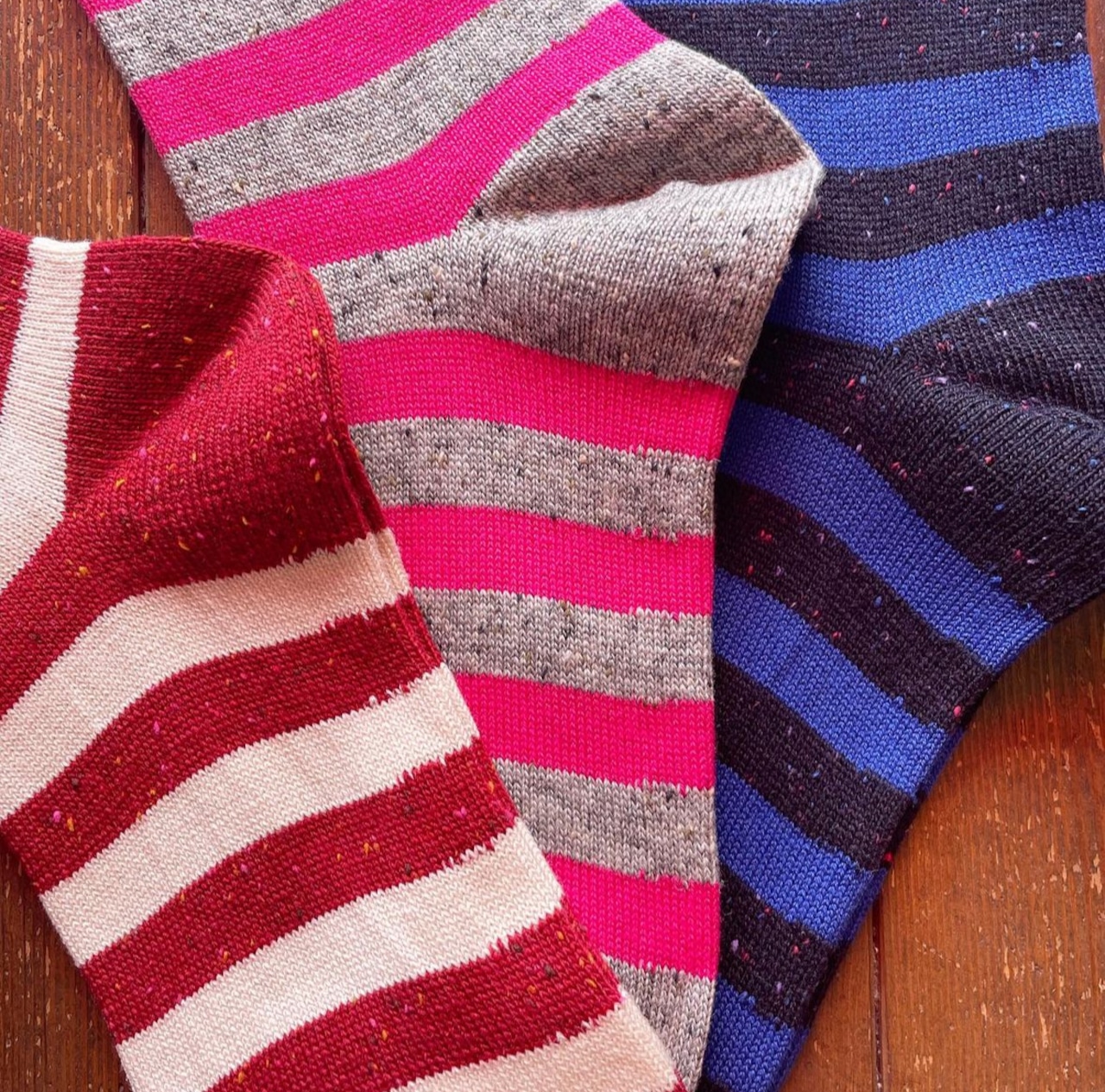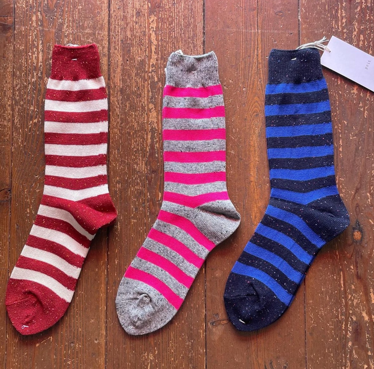 王道ボーダー柄に冬らしいネップ感を編み立てたほっこり癒しなソックスとなっています。