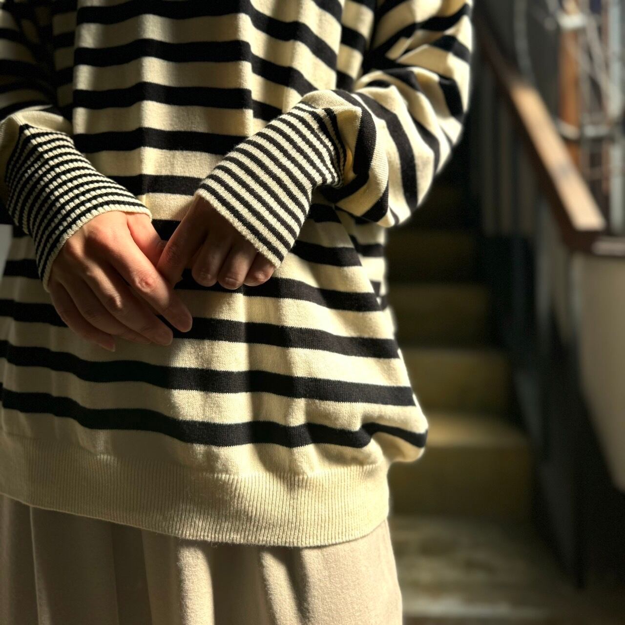 見頃部分と袖口部分のボーダーのピッチが異なるのもまた魅力的かと。