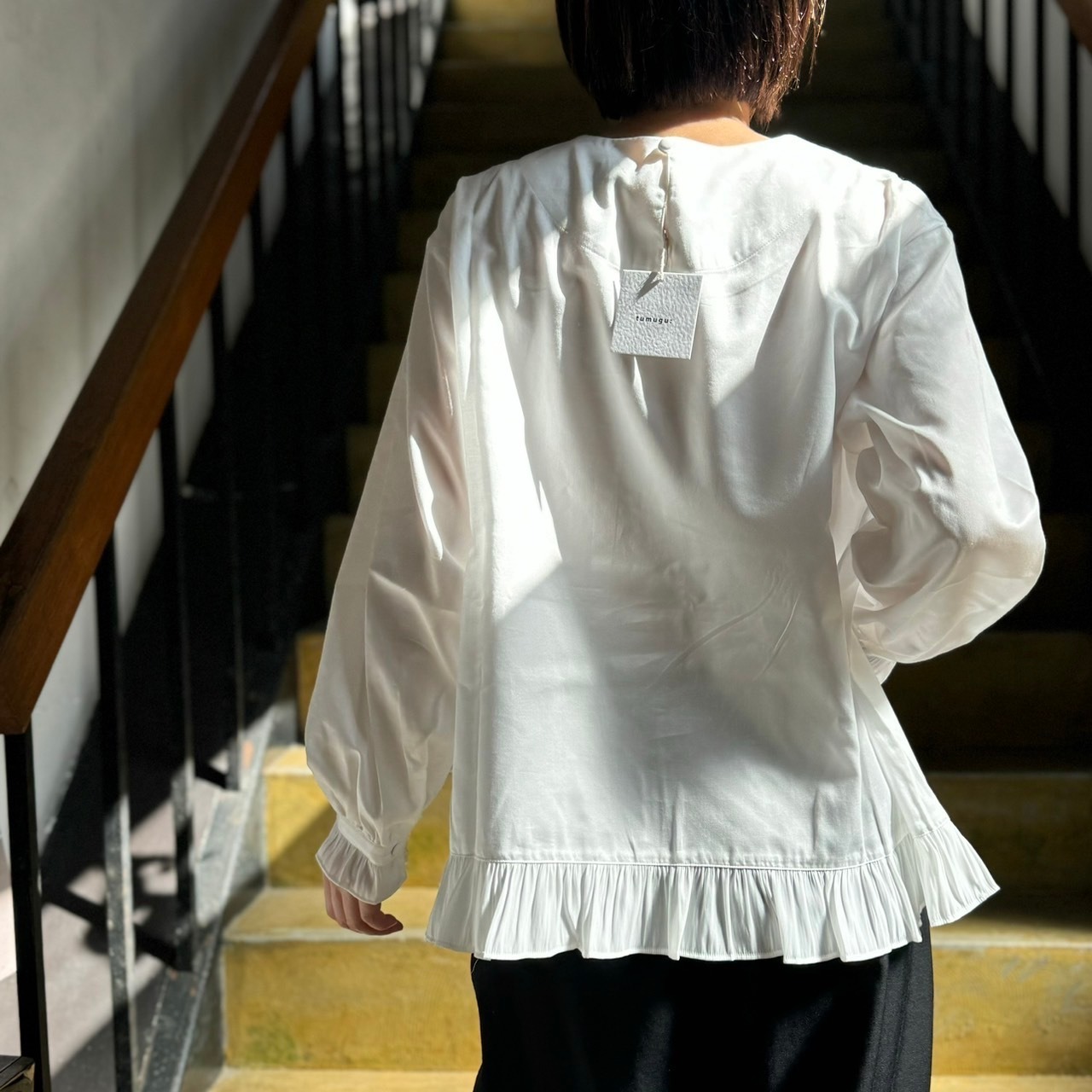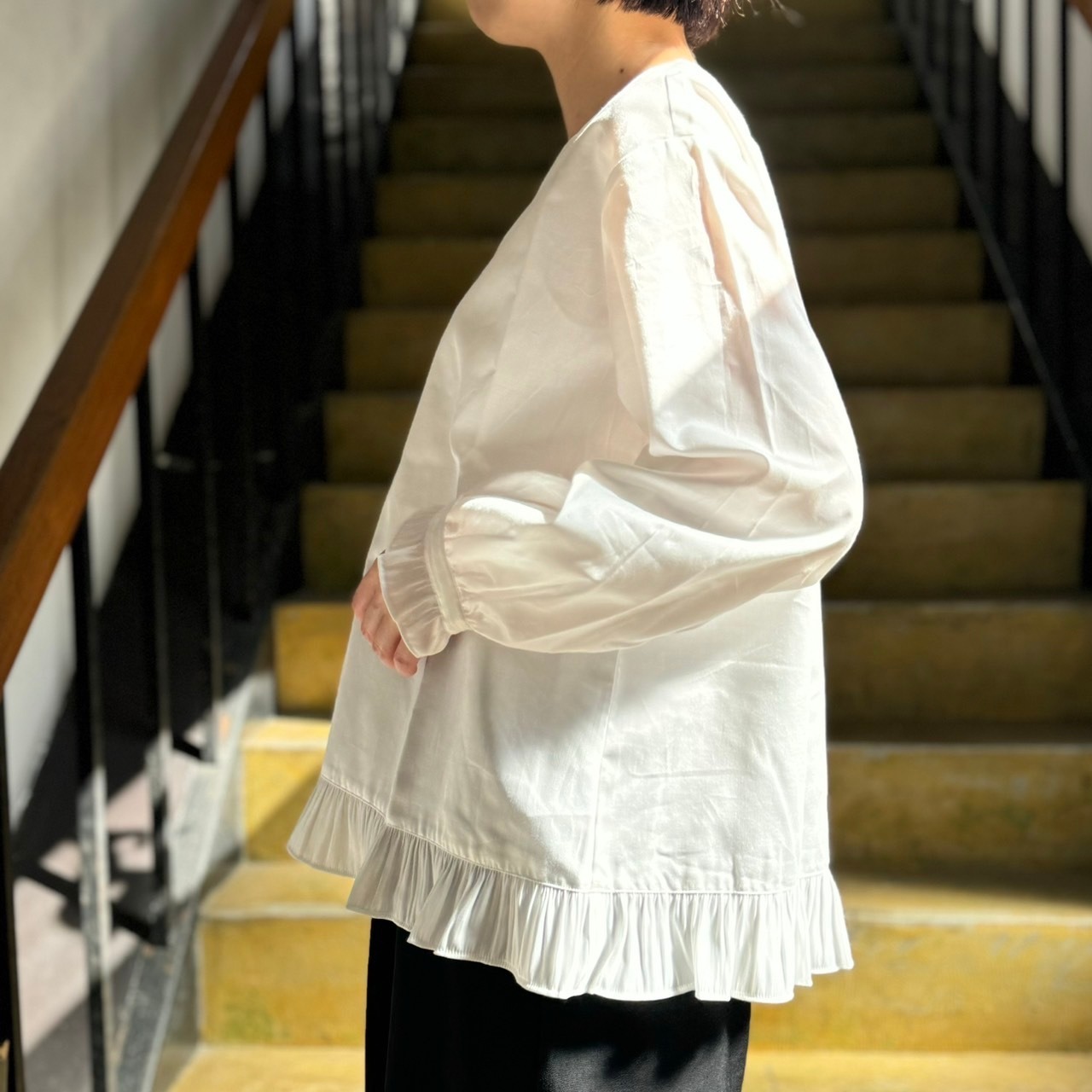 裾と袖口のフリルが可愛さ要素をプラスしたブラウスになっています。