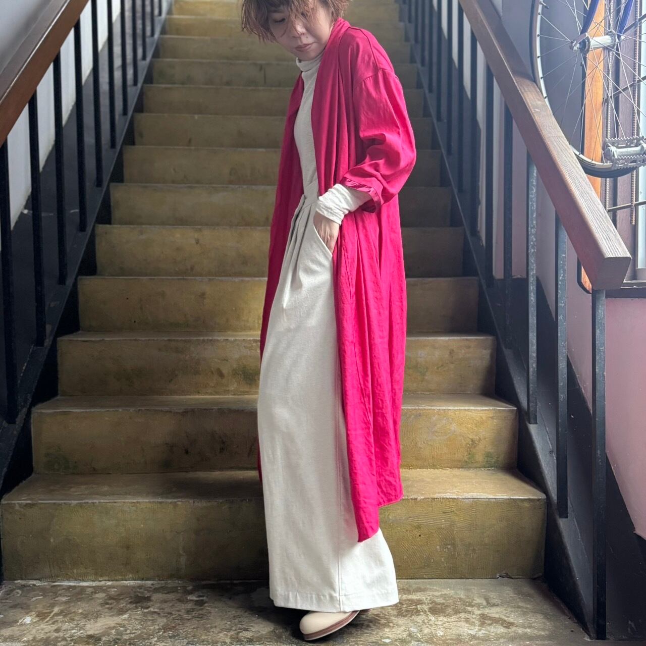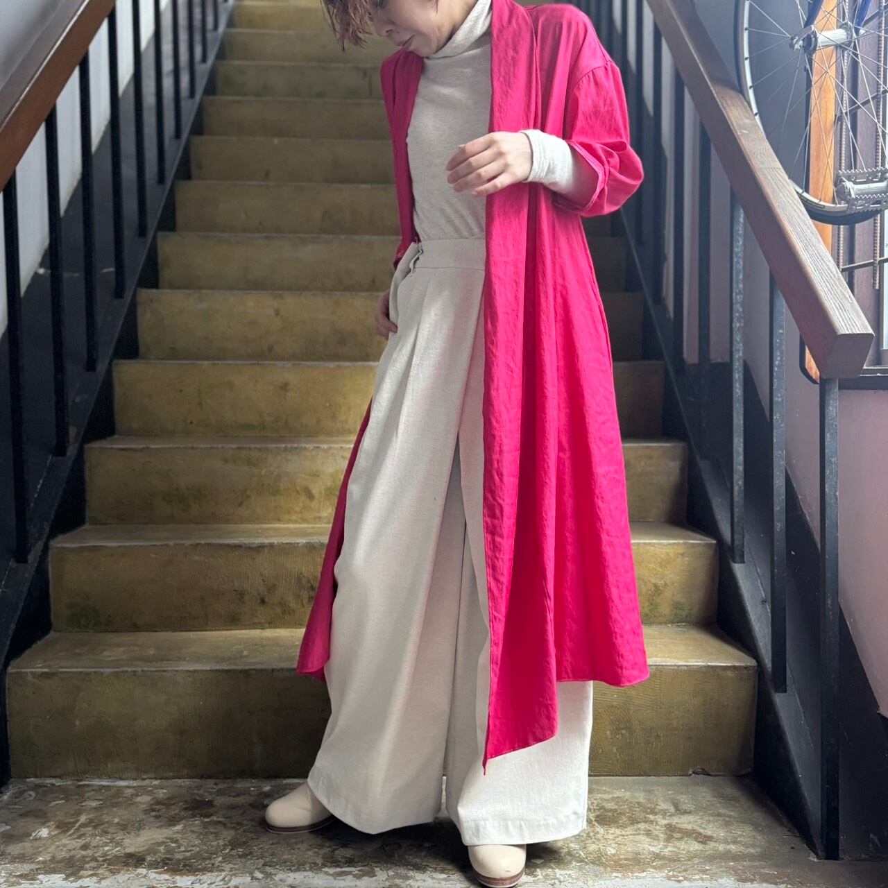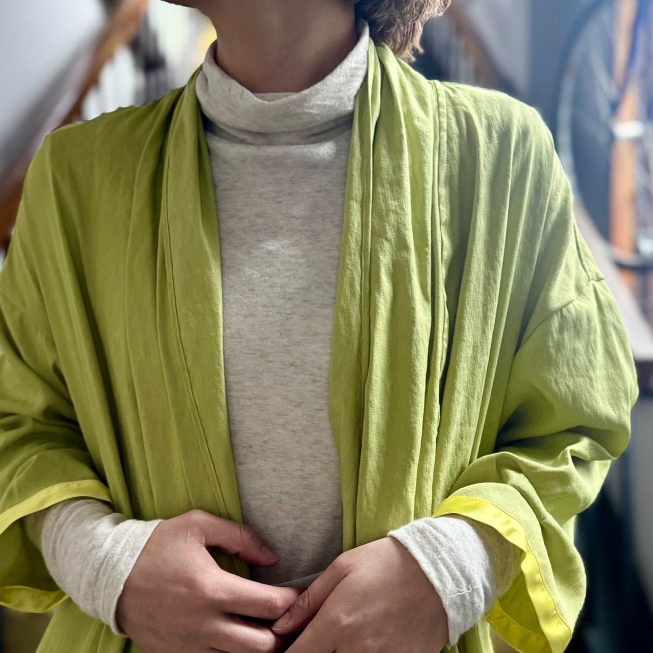 薄手で軽やか、そしていてしなやかなドレープの効いた軽めな羽織ものとなっています。
