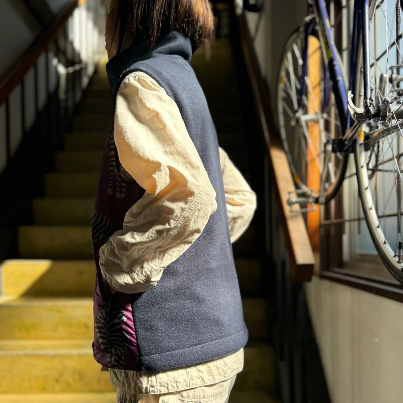 後ろは軽くて暖かい無地のフリース素材を合わせた