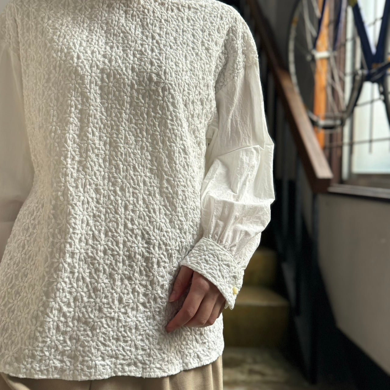 お花のような、規則柄のように見える生地刺繍を使ったブラウスです。