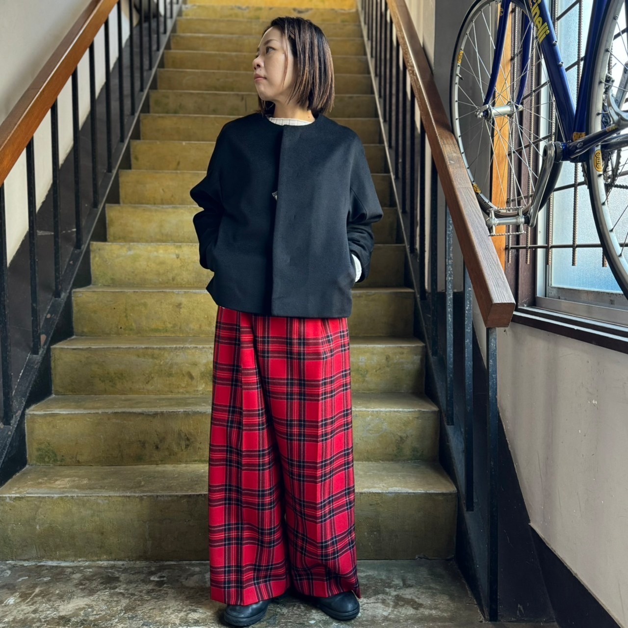 ボリュームのあるボトムスとの相性が良いショートコートで