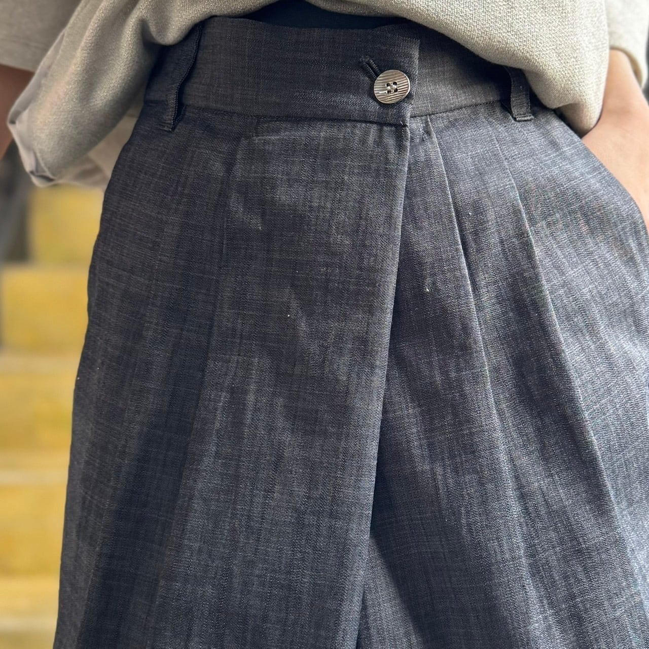 定番のオックスタックパンツを少し改良し前フックだった部分をボタンタイプに変更した