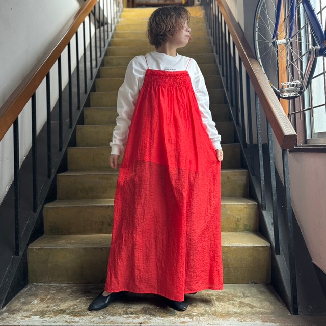 iki お馴染みキャミワンピ♪ ...................................................... 華奢な肩紐、透け感のギャザーキャミワンピ、今年も入荷です! 今年は胸元にシャーリングとボリューム感で印象をつけ、 後ろにはたっぷりとギャザーが入りにし大胆に後ろをあけたデザインとなっています。 透け感とハリコシを併せ持った独特な素材感でインパクトのある ワンピとしてコーデの主役に活かせるアイテムとなっています! 紙のような軽さの中に経糸にスパークナイロン、緯糸綿麻を使用しているので 動きによって光沢感を感じてもらえる表情豊かな素材となっています。 ikiオリジナルの素材で程よく上品でいて大人カジュアルにざっくりロンTと合わせても♪ フェミニンな可愛さで着ていただいても幅広いシーンでご活用できるアイテムです。 着こなしによって印象を変えれる着まわしにもってこいなワンピースです。 品番:31-01-OP-002-26-1 カラー:レッド/ブラック サイズ:FREE 総丈129.5cm(前後に調節可能) 身幅45cm 肩紐長さ90cm 着用モデル:154cm 麻54% 綿26% ナイロン20% 日本製